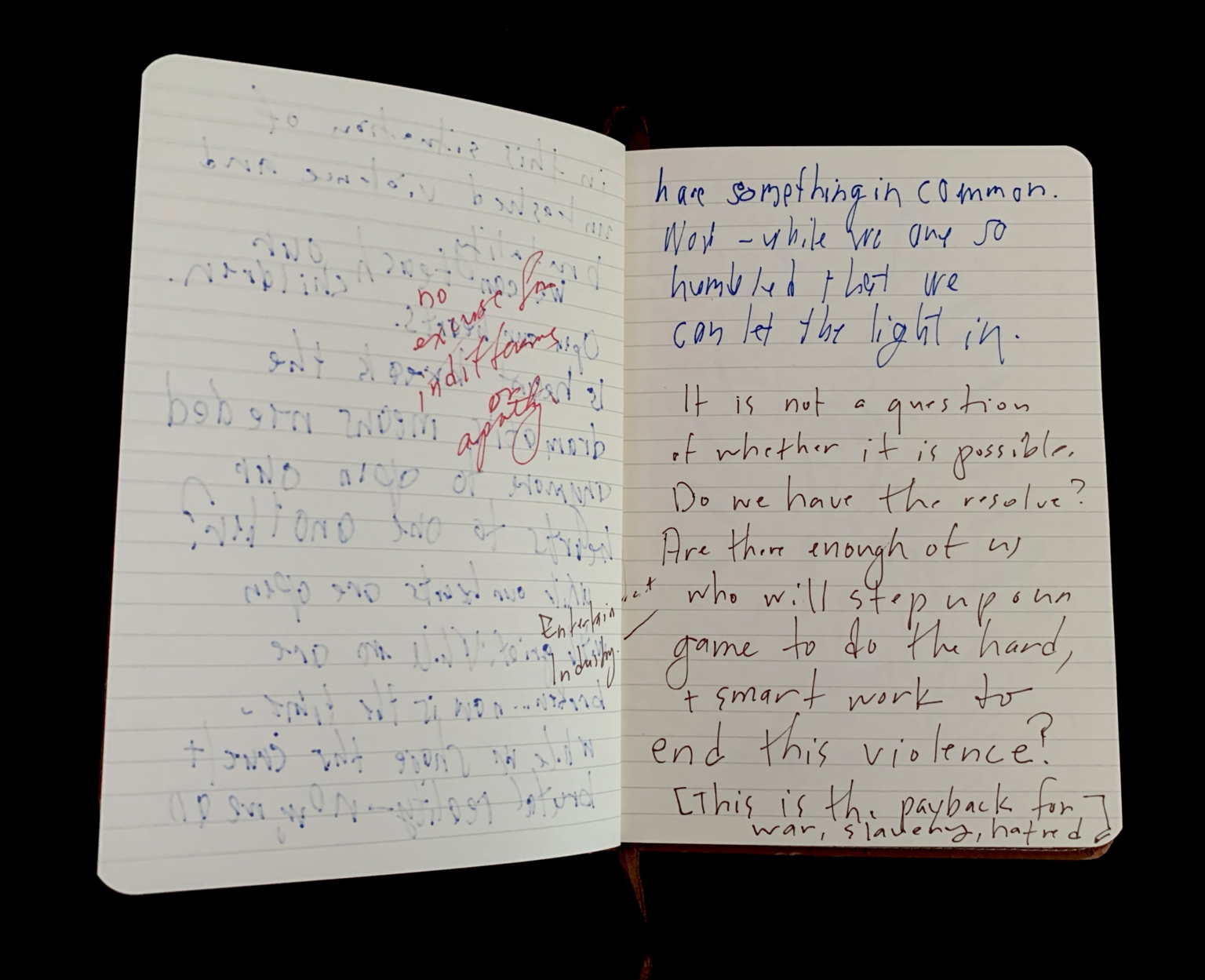 - Mantram pages; Beseeching the divine; Orlando shooting; Feeling abandoned; Distance from God; Moral high ground; American hypocrisy; Drone strikes; President Obama; Collateral damage; Piece 24 presentation; City of Dallas; Bryn the Corgi; Pet loss; Euthanizing dog; Grief; Presentation aftermath; Mass shooting; Public Art Committee; Approval of Piece 24; Quiet house; Hosting dinner; Kelly in Nebraska; Helping his Mom; Inner calling; Tanya Conovaloff surgery; Roxana health emergency; July remembrances; Barbara’s death; Mom’s birthday; Family picnics; Communion of grief; Police shooting; 29 Pieces messaging; Will to be better; Raw grief; One pure language; Hazrat Khan quote; Nice France violence; Baton Rouge killings; Mercy; History repeating; Pulitzer Centennial; War photographer questions