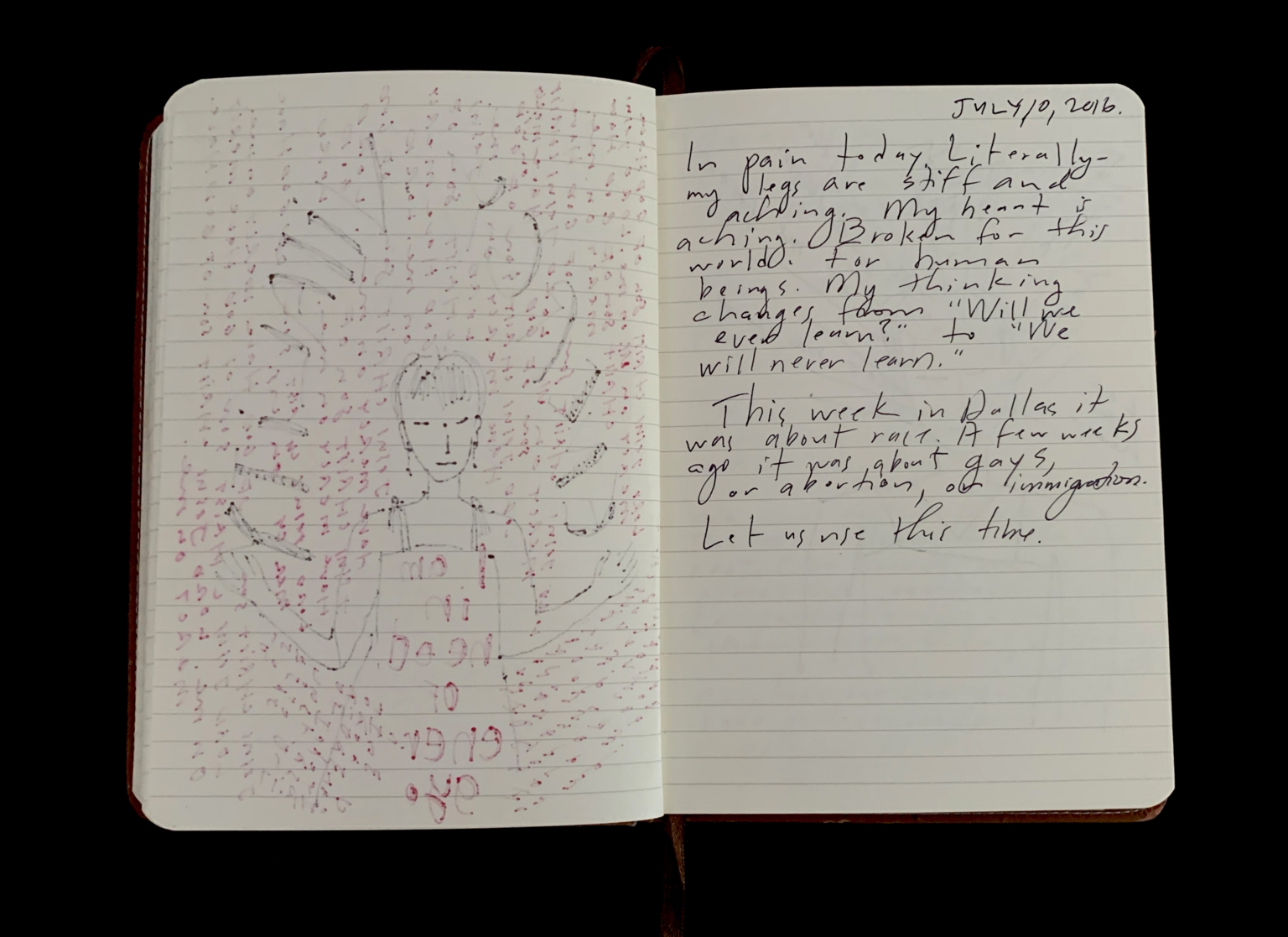 - Mantram pages; Beseeching the divine; Orlando shooting; Feeling abandoned; Distance from God; Moral high ground; American hypocrisy; Drone strikes; President Obama; Collateral damage; Piece 24 presentation; City of Dallas; Bryn the Corgi; Pet loss; Euthanizing dog; Grief; Presentation aftermath; Mass shooting; Public Art Committee; Approval of Piece 24; Quiet house; Hosting dinner; Kelly in Nebraska; Helping his Mom; Inner calling; Tanya Conovaloff surgery; Roxana health emergency; July remembrances; Barbara’s death; Mom’s birthday; Family picnics; Communion of grief; Police shooting; 29 Pieces messaging; Will to be better; Raw grief; One pure language; Hazrat Khan quote; Nice France violence; Baton Rouge killings; Mercy; History repeating; Pulitzer Centennial; War photographer questions