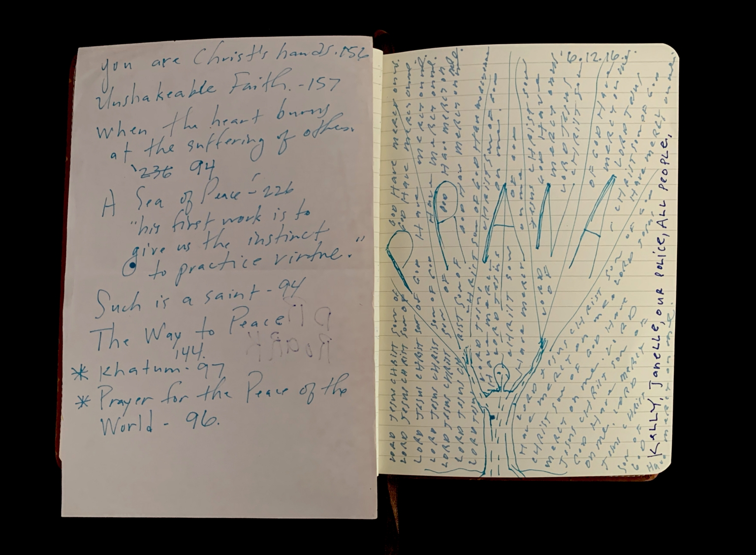 - Mantram pages; Beseeching the divine; Orlando shooting; Feeling abandoned; Distance from God; Moral high ground; American hypocrisy; Drone strikes; President Obama; Collateral damage; Piece 24 presentation; City of Dallas; Bryn the Corgi; Pet loss; Euthanizing dog; Grief; Presentation aftermath; Mass shooting; Public Art Committee; Approval of Piece 24; Quiet house; Hosting dinner; Kelly in Nebraska; Helping his Mom; Inner calling; Tanya Conovaloff surgery; Roxana health emergency; July remembrances; Barbara’s death; Mom’s birthday; Family picnics; Communion of grief; Police shooting; 29 Pieces messaging; Will to be better; Raw grief; One pure language; Hazrat Khan quote; Nice France violence; Baton Rouge killings; Mercy; History repeating; Pulitzer Centennial; War photographer questions