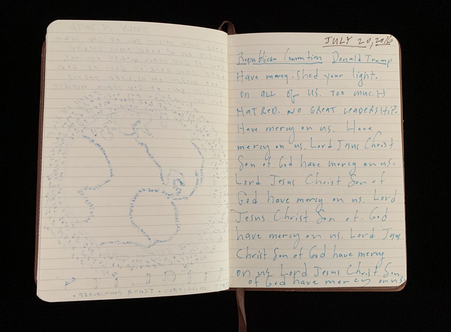 - Mantram pages; Beseeching the divine; Orlando shooting; Feeling abandoned; Distance from God; Moral high ground; American hypocrisy; Drone strikes; President Obama; Collateral damage; Piece 24 presentation; City of Dallas; Bryn the Corgi; Pet loss; Euthanizing dog; Grief; Presentation aftermath; Mass shooting; Public Art Committee; Approval of Piece 24; Quiet house; Hosting dinner; Kelly in Nebraska; Helping his Mom; Inner calling; Tanya Conovaloff surgery; Roxana health emergency; July remembrances; Barbara’s death; Mom’s birthday; Family picnics; Communion of grief; Police shooting; 29 Pieces messaging; Will to be better; Raw grief; One pure language; Hazrat Khan quote; Nice France violence; Baton Rouge killings; Mercy; History repeating; Pulitzer Centennial; War photographer questions