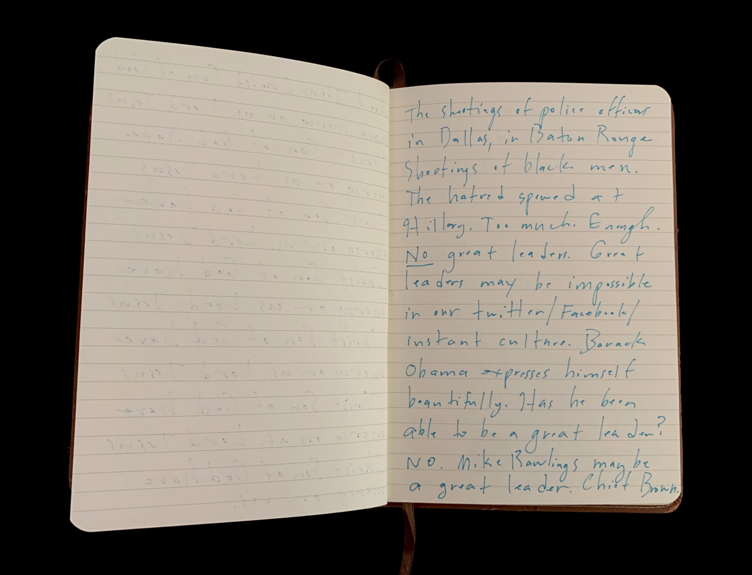 - Mantram pages; Beseeching the divine; Orlando shooting; Feeling abandoned; Distance from God; Moral high ground; American hypocrisy; Drone strikes; President Obama; Collateral damage; Piece 24 presentation; City of Dallas; Bryn the Corgi; Pet loss; Euthanizing dog; Grief; Presentation aftermath; Mass shooting; Public Art Committee; Approval of Piece 24; Quiet house; Hosting dinner; Kelly in Nebraska; Helping his Mom; Inner calling; Tanya Conovaloff surgery; Roxana health emergency; July remembrances; Barbara’s death; Mom’s birthday; Family picnics; Communion of grief; Police shooting; 29 Pieces messaging; Will to be better; Raw grief; One pure language; Hazrat Khan quote; Nice France violence; Baton Rouge killings; Mercy; History repeating; Pulitzer Centennial; War photographer questions