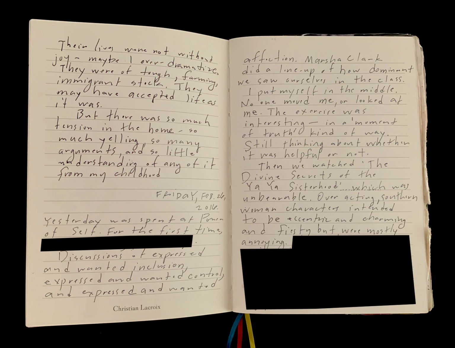 - The image depicts an open journal laying flat. The pages are filled with handwritten text in English, featuring a personal narrative and reflections. The text spans two pages. On the left page, the writing covers various topics, mentioning family dynamics and childhood experiences. The text is written in black ink, and there are areas redacted with black rectangles. The entry is dated "Friday, Feb. 26," with the year partially obscured. The journal's edge shows several colorful ribbon bookmarks. At the bottom of the left page, the words "Christian Lacroix" are printed in small font.