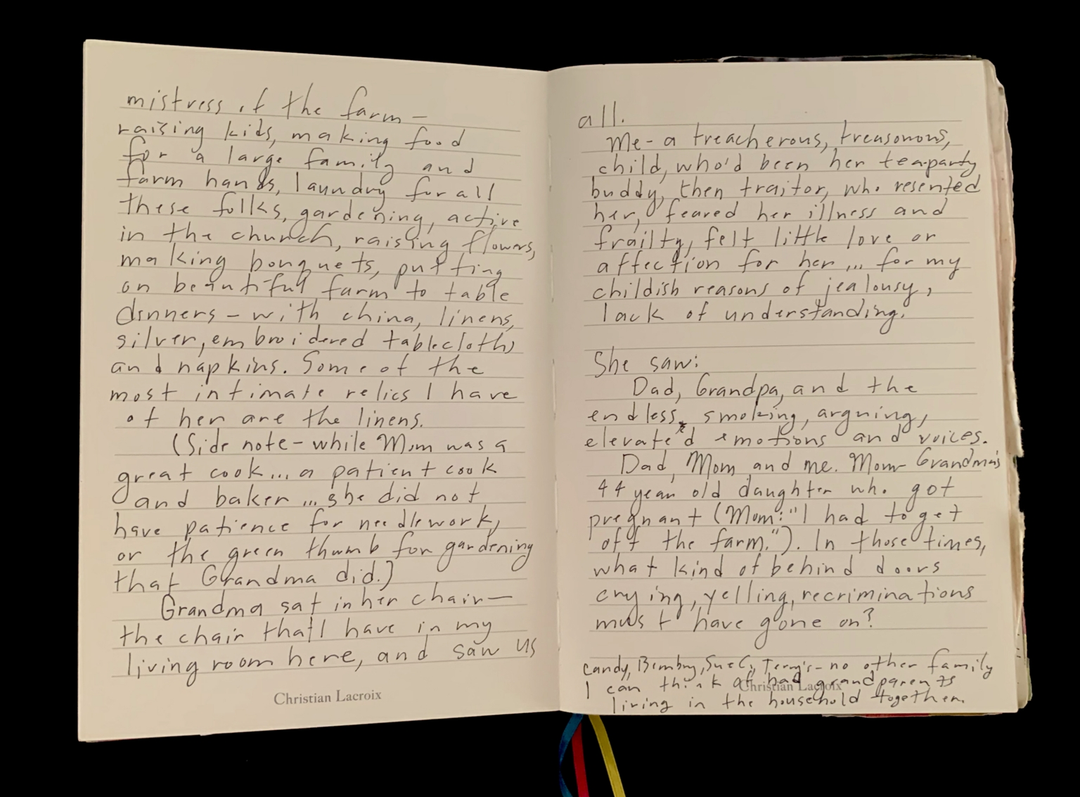 - The image is a close-up of an open journal displaying two pages filled with handwritten text in English. The writing is in black ink on cream-colored, lined paper. The left page discusses the role of the "mistress of the farm," detailing tasks such as raising children, making food, and gardening. A side note mentions the writing subject's abilities in cooking and baking, but lack of patience for needlework or gardening. The right page reflects on personal feelings and family dynamics, describing a sense of resentment and lack of understanding from a child’s perspective. There is mention of observing family members, including a pregnant daughter, and pondering what kind of behind-the-doors conversations might have occurred. At the bottom of both pages, there are references to names and what appears to be a signature or attribution, "Christian Lacroix."