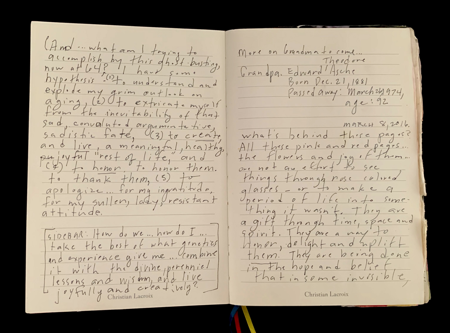 "(And... what am I trying to accomplish by this ghost-busting, now at 64? I have some hypothesis - (1) to understand and explode my grim outlook on aging, (2) to extricate myself from the inevitability of that sad, convoluted argumentative, sadistic fate, (3) to create, and live, a meaningful, healthy, joyful "rest of life," and (4) to honor. To honor them. To thank them, (5) to apologize... for my ingratitude, for my sullen, lazy, resistant attitude.