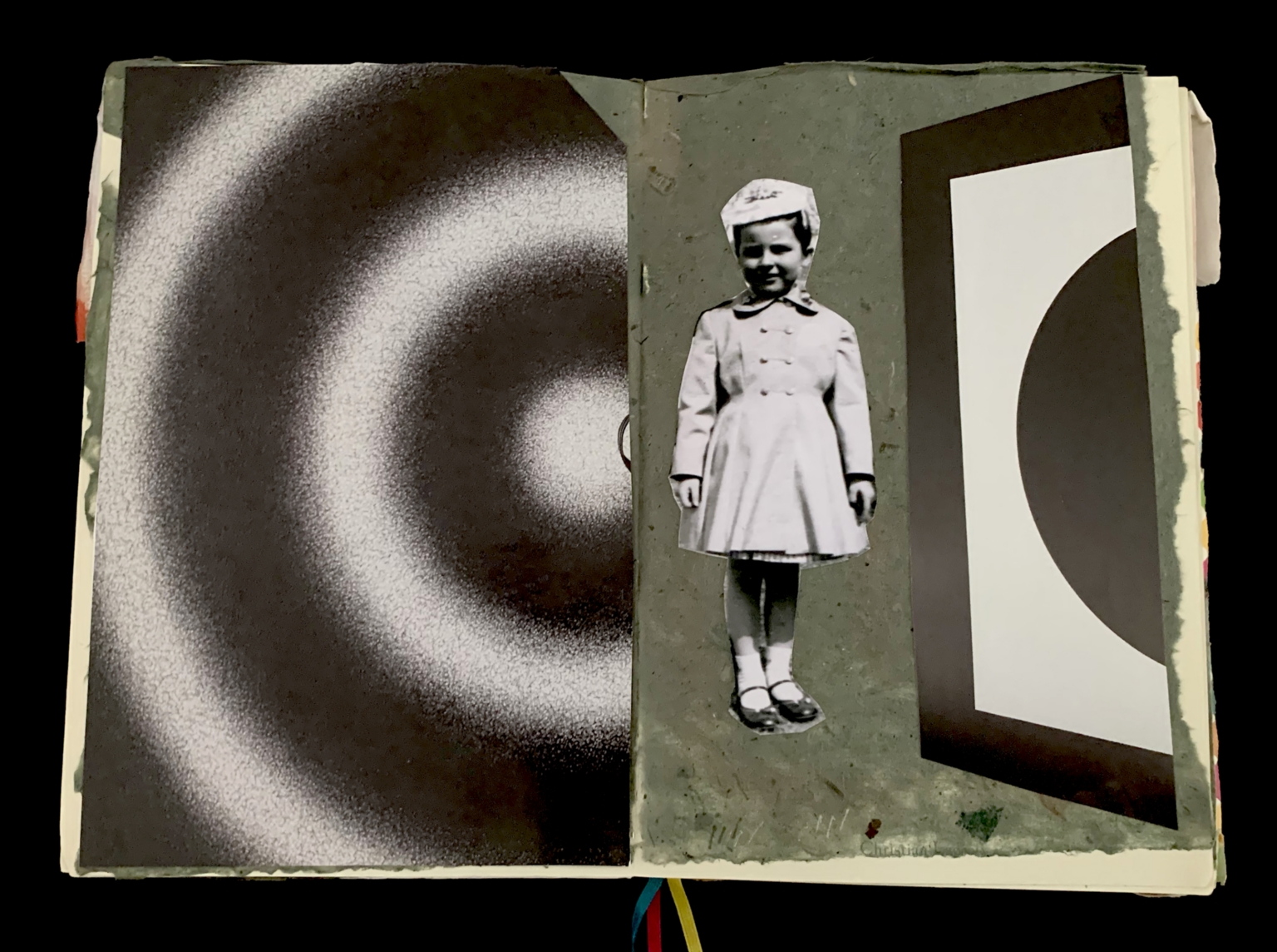 - The image shows an open journal with two pages visible. The left page features a black and white design consisting of concentric circles, creating a gradient effect from dark to light as they move outward. The right page displays a monochrome cut-out of a young girl in a dress and hat, positioned upright against a textured green background. Adjacent to the girl's image, there is a section of a geometric black and white pattern featuring bold, curved shapes. The pages have a somewhat rough, hand-crafted appearance, with uneven edges.