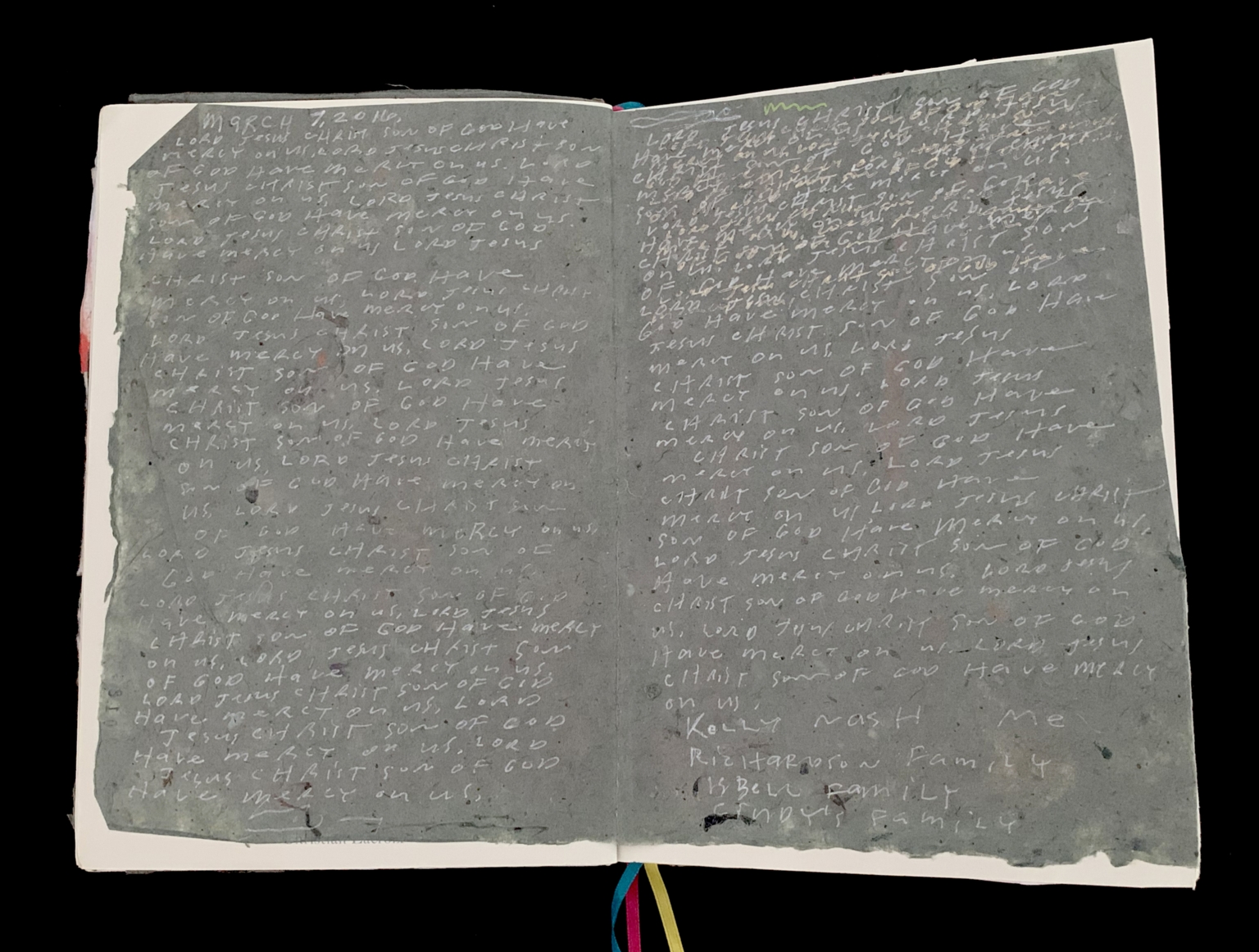 - The image depicts an open journal with pages made of textured, dark gray paper. The journal contains densely packed handwritten text in white, covering both pages. The handwriting is in a casual style with some words overlapping slightly. There are no visible margins, indicating that the writing fills up most of the pages from top to bottom, left to right. The paper has a rough, uneven texture, enhancing a handmade or artistic feel. Some colorful ribbons extend from the bottom binding of the journal.