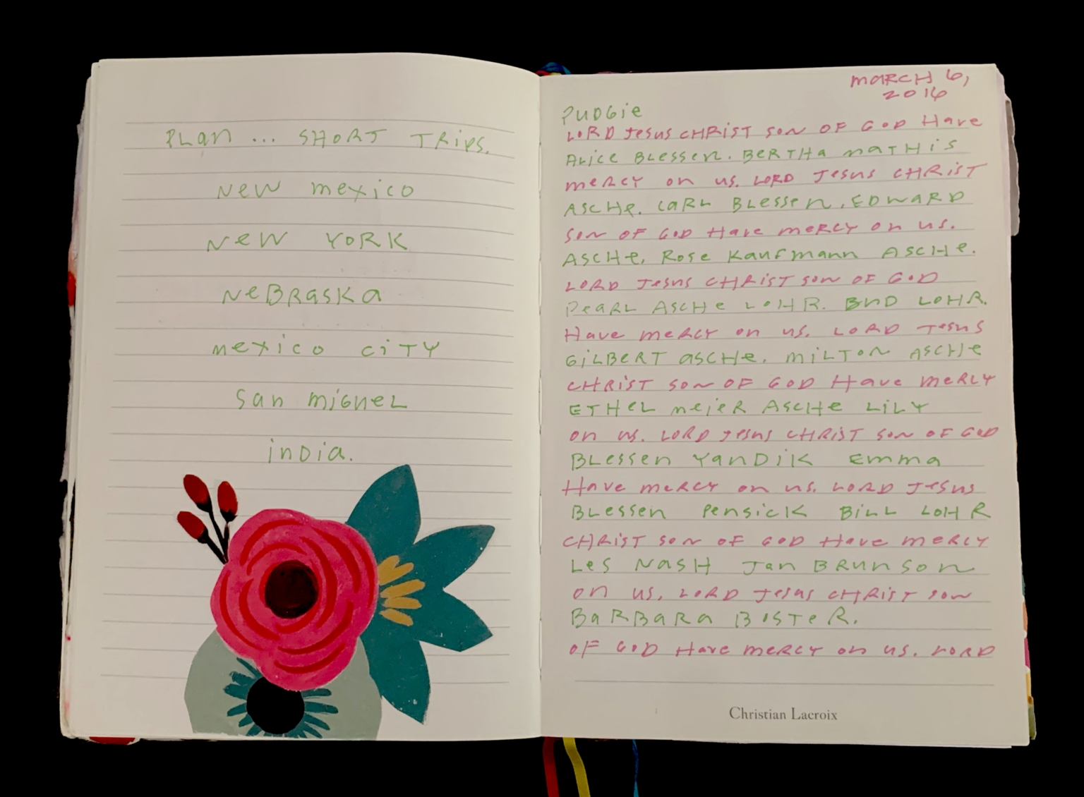 - Family; Parents; Grandparents; Maternal aunts and uncles; Childhood memories; Ghost busting; Revisionist history; Love; Forgiveness; Lingering ghosts; First pet; Pudgie the dog; Gift and loss; Ray of light extinguished; Grandmother’s life; Mother-daughter relationship; Hard work; Treasonous child; Reimagining childhood; Understanding; Devotion; Loyalty; Protection; Perspective; Kip Lott; Piece 24; Prayer pages; Mantram pages; Afiza; Mowgli; Hope Trevino; Mauricio Navarro; Diane Van Buren; Artist attack; Rape; Grandma Asche; Grandpa Asche; Grandma Blessen; Living room conflict; Tension; Arguments; Yelling; Smoking; Drinking; Super collider metaphor; Bringing color; Childhood letter; Betrayal; Friendship loss; Grandma Asche’s offspring; Time off; Pets; Animals; 1964–2016; 2016 elections; Political noise; Centering chart; Grounding; April 21, 2016; Prince dies