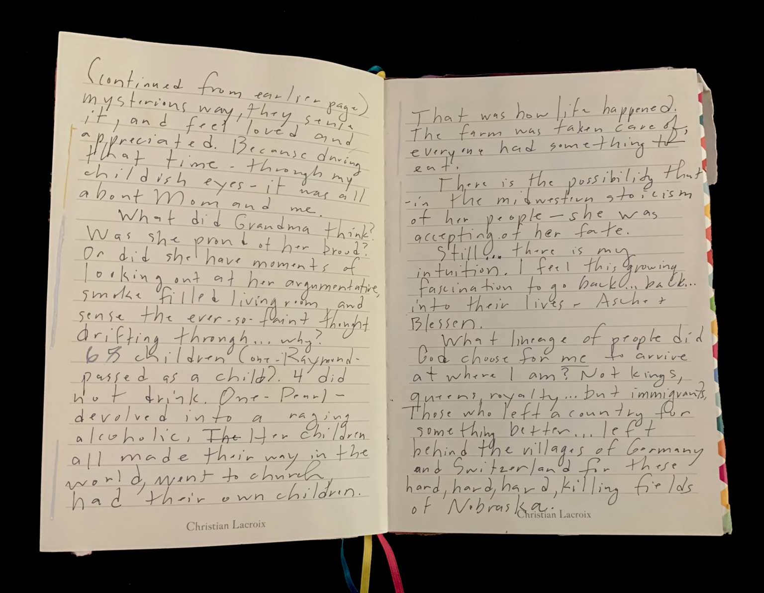- The image depicts an open journal with two pages containing handwritten text in English. The left page features text beginning with a parenthetical note "(Continued from earlier page)" and a narrative reflecting on familial thoughts, mentioning "Grandma" and discussing the upbringing and lives of ancestors and their children. The handwriting is neat and slanted, with occasional underlining for emphasis. The page bottom shows the name "Christian Lacroix," possibly the journal brand. The right page continues the narrative, exploring themes of life events, stoicism, and ancestry. The right edge of the page features a series of colorful dots. The background is a solid black surface.