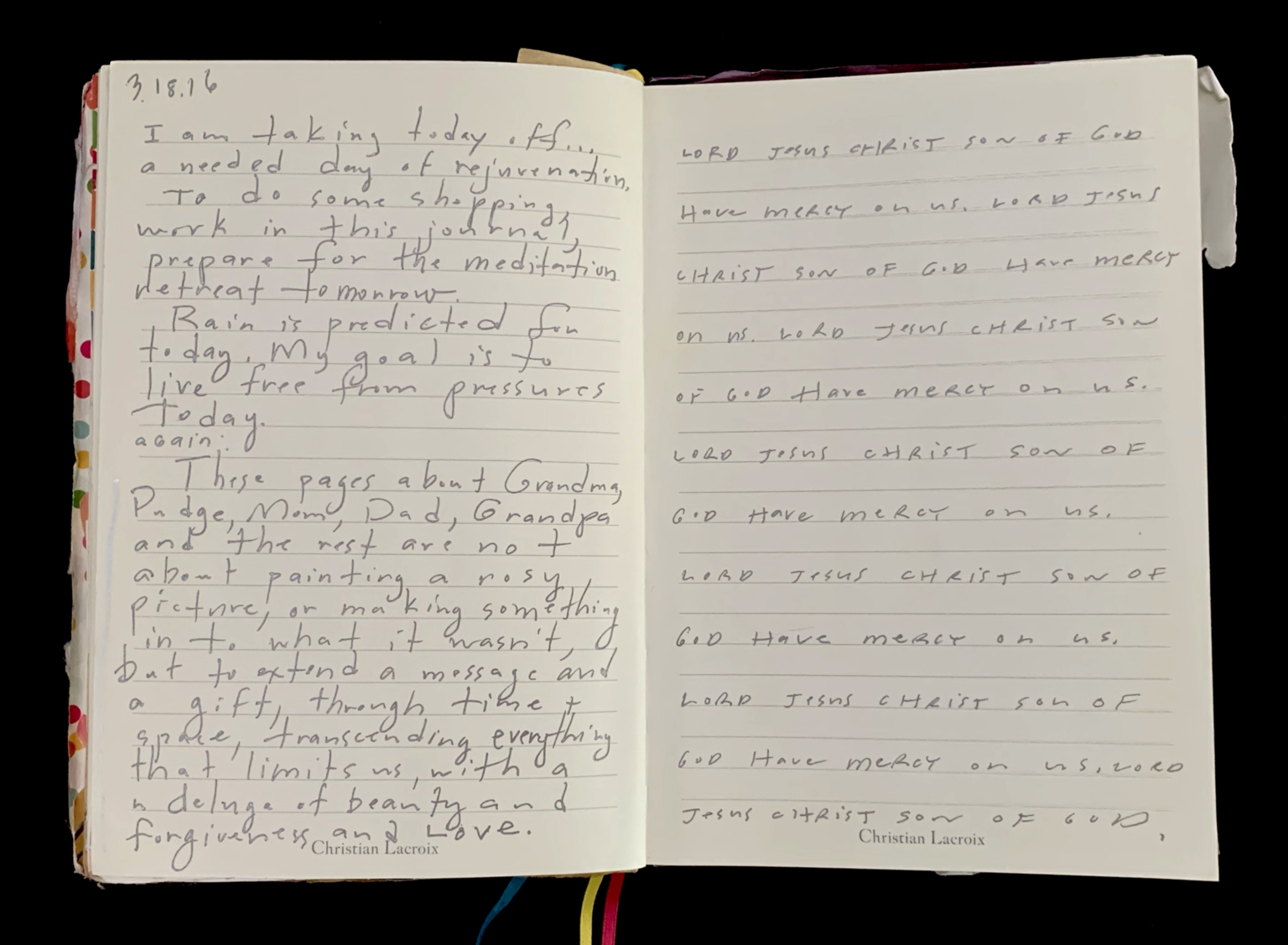 - The image displays an open journal with two pages of handwritten text. The left page contains a personal reflection, dated "3.18.96," discussing taking a day off for rejuvenation, free from pressure. It mentions family members and the intention to transcend limitations through love and forgiveness. The handwriting is cursive and spans several lines. The right page features repeated lines of a religious nature, invoking "Lord Jesus Christ, Son of God, have mercy on us." Each line is evenly spaced and neatly written across the page. The name "Christian Lacroix" is printed at the bottom of both pages.
