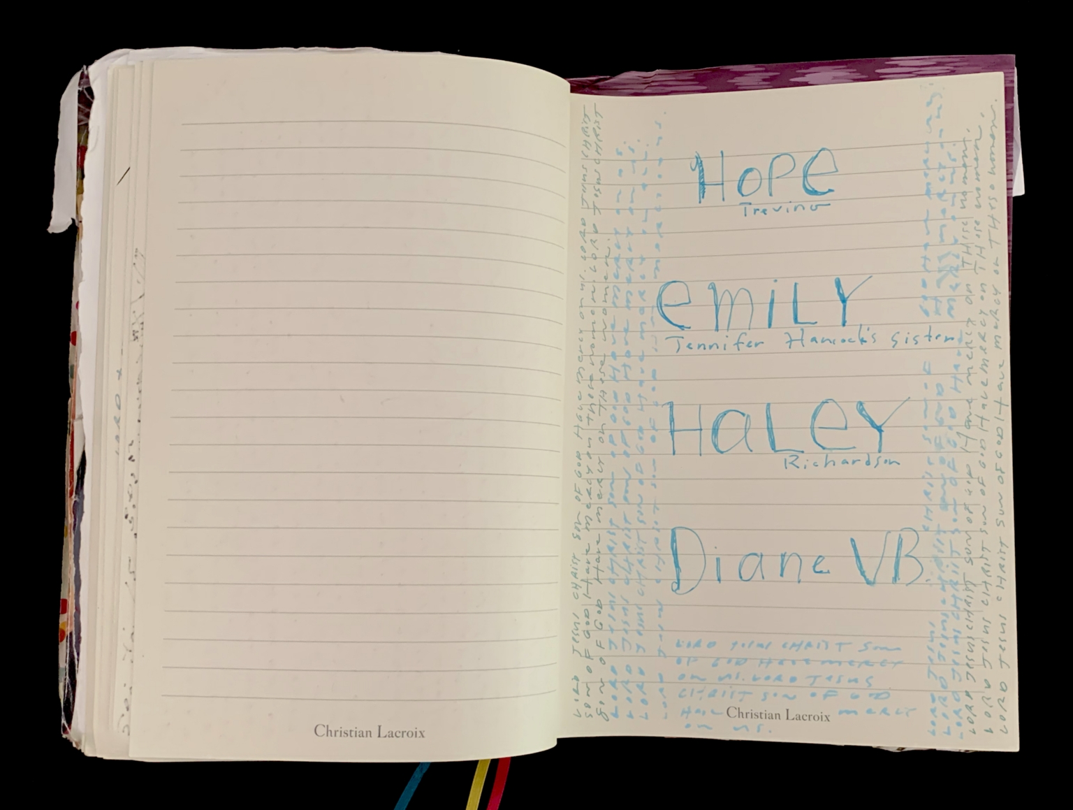 - The image showcases an open journal with two lined pages. The left page is blank, with "Christian Lacroix" printed at the bottom. The right page contains handwritten text and blue pen artwork. There are four large, capitalized names written vertically in blue: "Hope Trevino," "Emily," "Haley Richardson," and "Diane VB." Each name is spaced apart. Additional horizontal text in small handwriting is present on the sides.