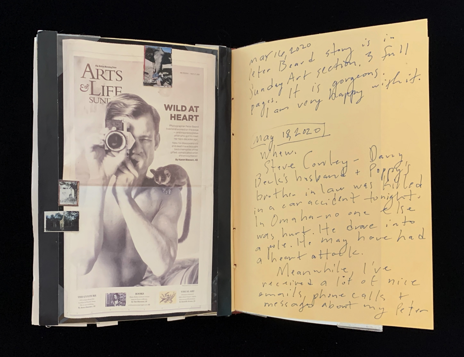 - The left side of the page displays a magazine clipping from "Arts & Life Sunday" with the headline "Wild at Heart." The image shows a man holding a camera with a small animal perched on his shoulder. The right side of the page contains handwritten notes dated May 18, 2020, discussing a personal tragedy and receiving messages about someone named Peter.