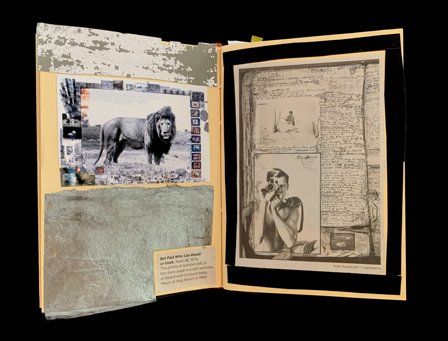 - The left side of the page contains a photograph of a lion in a naturalistic setting, with a textured, weathered paper background. The right side displays a black-and-white self-portrait of a man holding a camera, with handwritten notes and doodles surrounding the image. The paper appears aged, with visible creases and discoloration, suggesting it is part of a vintage scrapbook.
