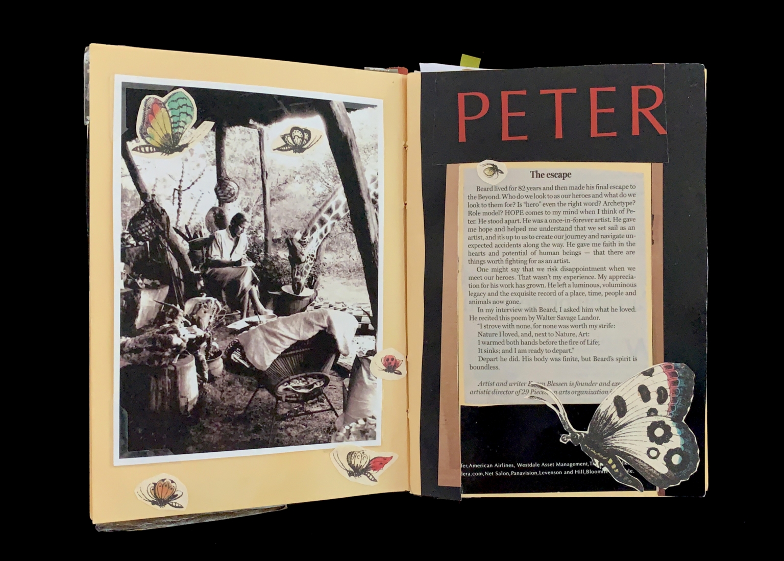 - The page is part of a scrapbook. On the left side, there is a black-and-white photograph of a person sitting outdoors, surrounded by natural elements such as trees and what appears to be a makeshift shelter. The person is seated on a chair with a cloth draped over it, and there are various objects around, including what looks like a bowl and some other items on the ground. The right side of the page contains text with the title "PETER" in red at the top. Below the title, there is a column of text discussing "The escape" and "The artist and writer." Decorative elements include butterfly cutouts and a small butterfly illustration at the bottom of the left page.
