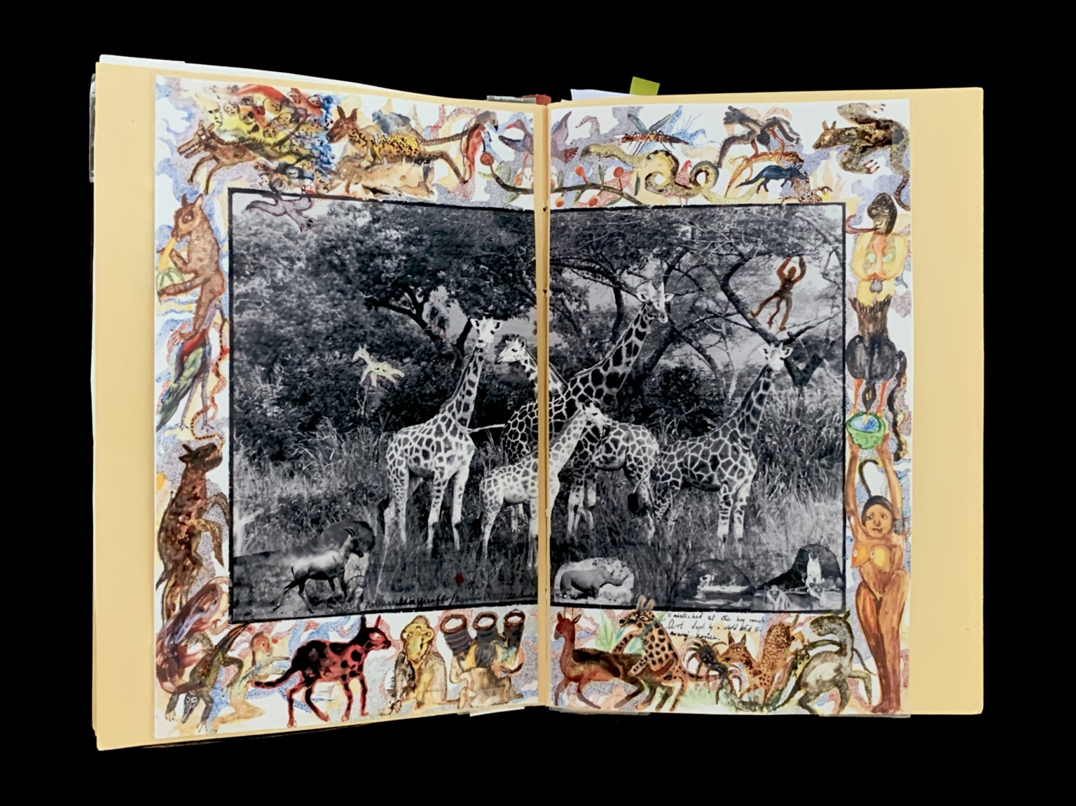 - The image is a double-page spread in a scrapbook or collage art style. The central photograph is a black-and-white depiction of a group of giraffes in a savanna setting, with trees and shrubs in the background. Surrounding this photograph are various colorful illustrations and doodles. On the left side, there are drawings of a kangaroo, a crocodile, and other animals, including a horse and a donkey. On the right side, there are more animals, such as a lion, a zebra, and a giraffe, along with a human figure in a yellow outfit. The borders of the pages are filled with additional doodles and illustrations, creating a lively and eclectic composition.