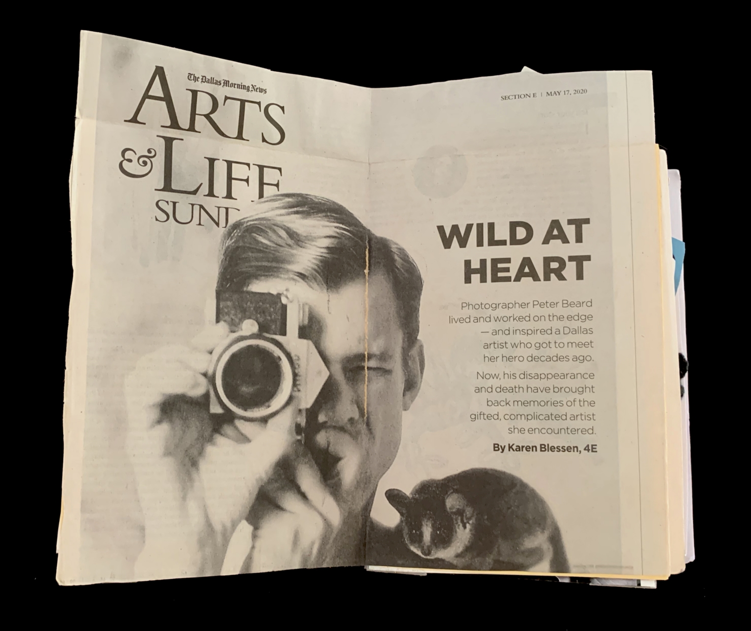 - The page is from the "Arts & Life" section of "The Dallas Morning News," dated May 17, 2020. The article is titled "Wild at Heart" and discusses photographer Peter Beard. The image on the page shows a black-and-white photograph of Peter Beard holding a camera, with a small animal, possibly a marsupial, in the bottom right corner. The page has a clean, professional layout with a focus on the photograph and text.