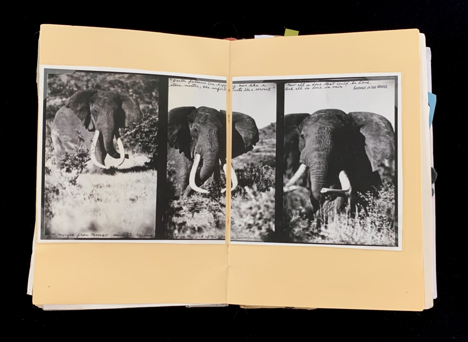 - The image is a triptych photograph of an elephant in a natural, possibly savanna-like environment. The elephant is depicted from the side, with its trunk extended towards the ground, possibly feeding or interacting with the vegetation. The photograph is in black and white, giving it a classic, timeless feel. The background consists of dry grass and sparse vegetation, typical of a savanna. The edges of the photograph are slightly worn, suggesting age or frequent handling. Handwritten text is present at the bottom of the photograph, adding a personal or interpretive element to the image.