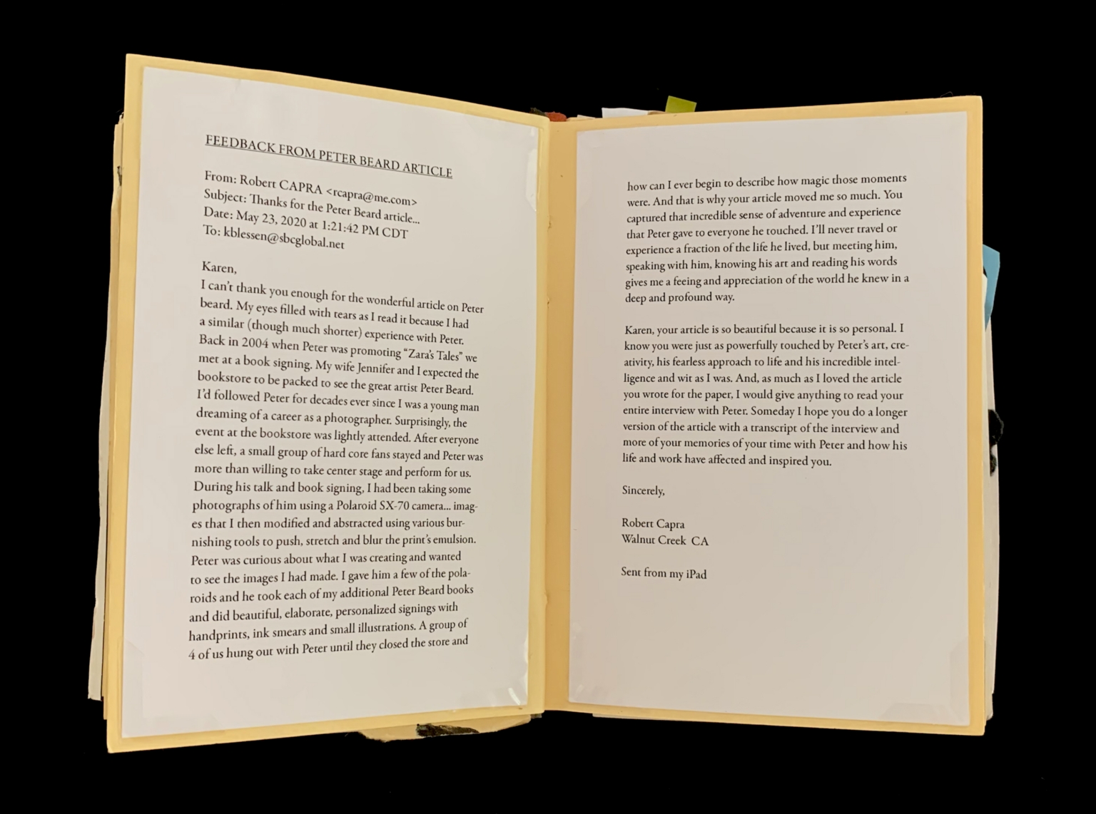 Karen, your article is so beautiful because it is so personal. I know you have a great appreciation for Peter's creativity, his fearless approach to life and his incredible intelligence and wit as I was. And, as much as I loved the article you wrote for the paper, I would give anything to read your entire interview with Peter. Someday I hope you do a longer version of the article with a transcript of the interview and more of your memories of your time with Peter and how his life and work have affected and inspired you.