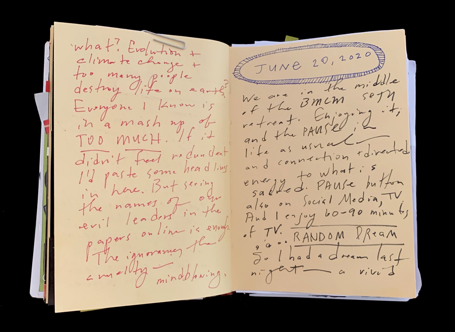 - The image shows an open journal with yellow pages. The left page contains red handwriting, while the right page has black handwriting. The top right corner of the right page is circled and labeled "JUNE 20, 2020." There are no visible art or photos, but there are some doodles, including a small drawing of a snake near the top right corner of the right page.