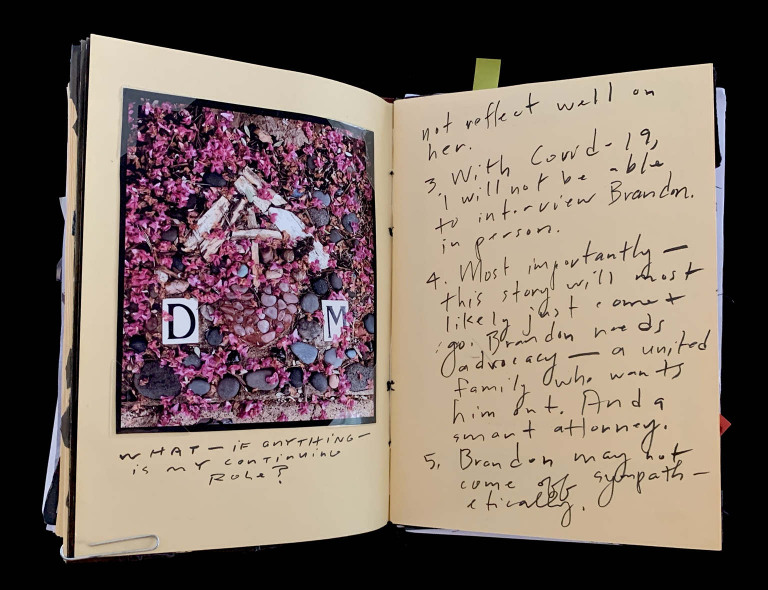 - The left page features a photograph of a stone arrangement with the letters "D" and "M" prominently displayed. The stones are arranged in a circular pattern, with pink petals scattered around. The right page contains handwritten notes discussing the challenges of storytelling, particularly regarding the COVID-19 pandemic and the need for advocacy and legal support for a person named Brandon. The notes are written in a casual, cursive style.