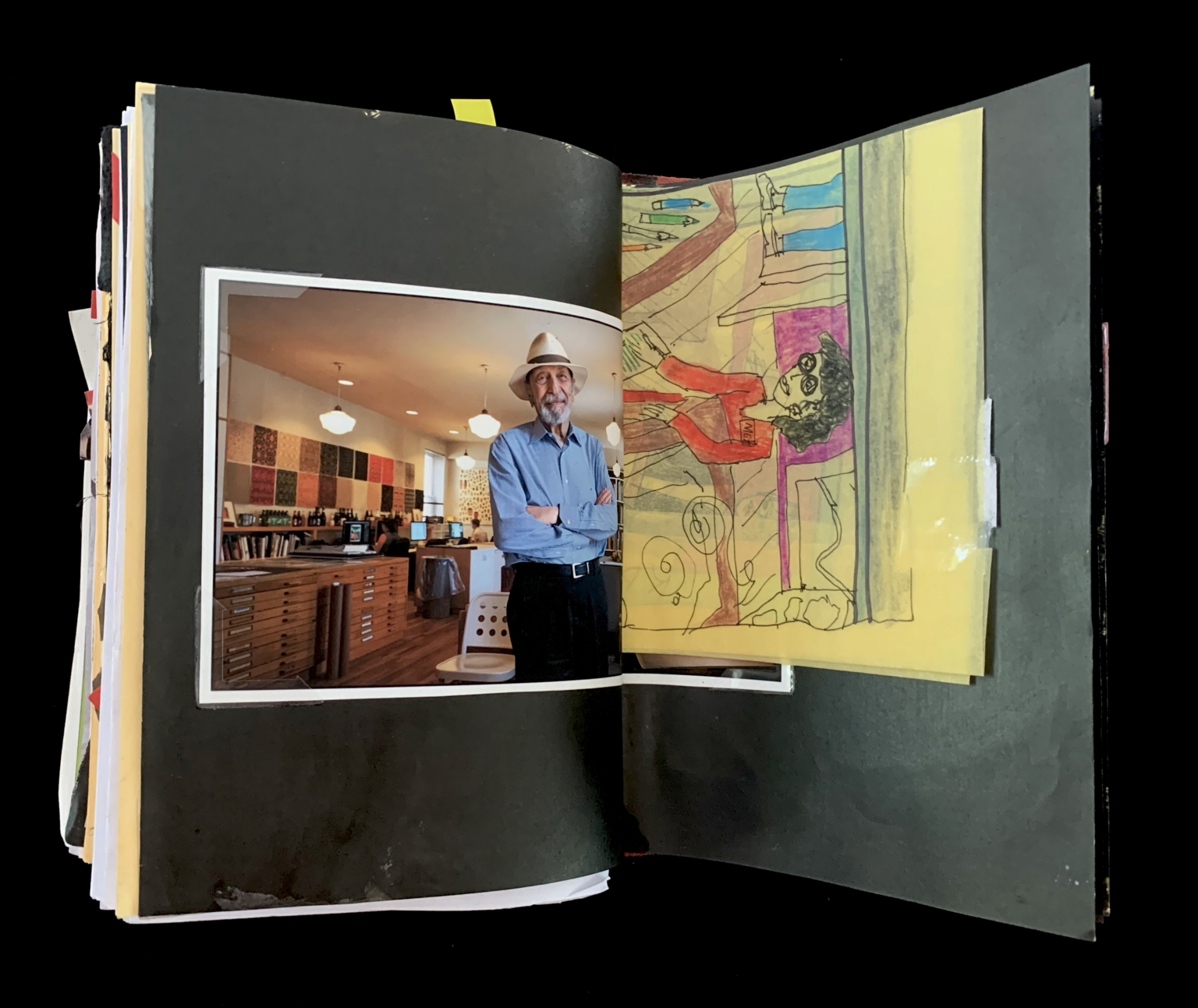 - The left page features a photograph of a man wearing a hat, standing with his arms crossed in a room that appears to be a workspace or studio. The room has wooden floors, a counter with various items, and shelves with books and other objects. The right page contains a colorful doodle with abstract shapes and figures, including a person in red and another in pink, with various lines and patterns surrounding them.