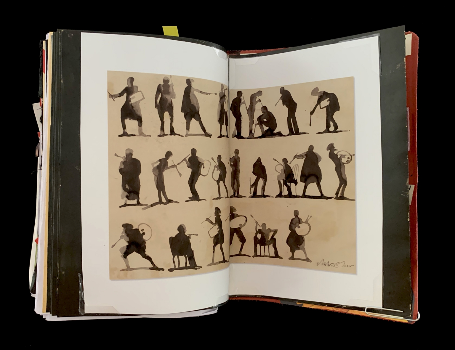 - The image displays a collection of detailed silhouettes of musicians and dancers, rendered in black ink on a beige background. The figures are depicted in various poses, some playing instruments like drums, flutes, and stringed instruments, while others are in dynamic dance movements. The artwork is signed in the bottom right corner with the name "Micki Davis."