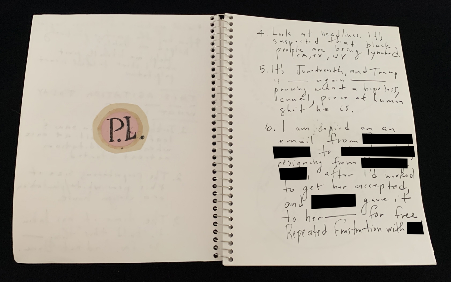 - The image shows an open spiral-bound notebook. On the left page, there is a circular sticker with the letters "P.L." in the center. The right page contains handwritten text, with some parts redacted for privacy. The text appears to be a list of points, possibly notes or reflections, with some entries partially obscured.