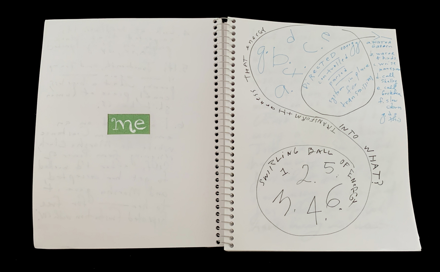 - The image shows an open notebook with a spiral binding. The left page has a green label with the word "me" in lowercase. The right page contains various handwritten notes and doodles. At the top, there are two circles with letters and numbers inside them. Below these circles, there is a larger circle with the text "SWIRLING BALL OF ENERGY" and numbers "1, 2, 5, 3, 4, 6" written inside it. Additional handwritten text is scattered around the page, including phrases like "that insect," "that insect," "picketed energy," and "into what?".
