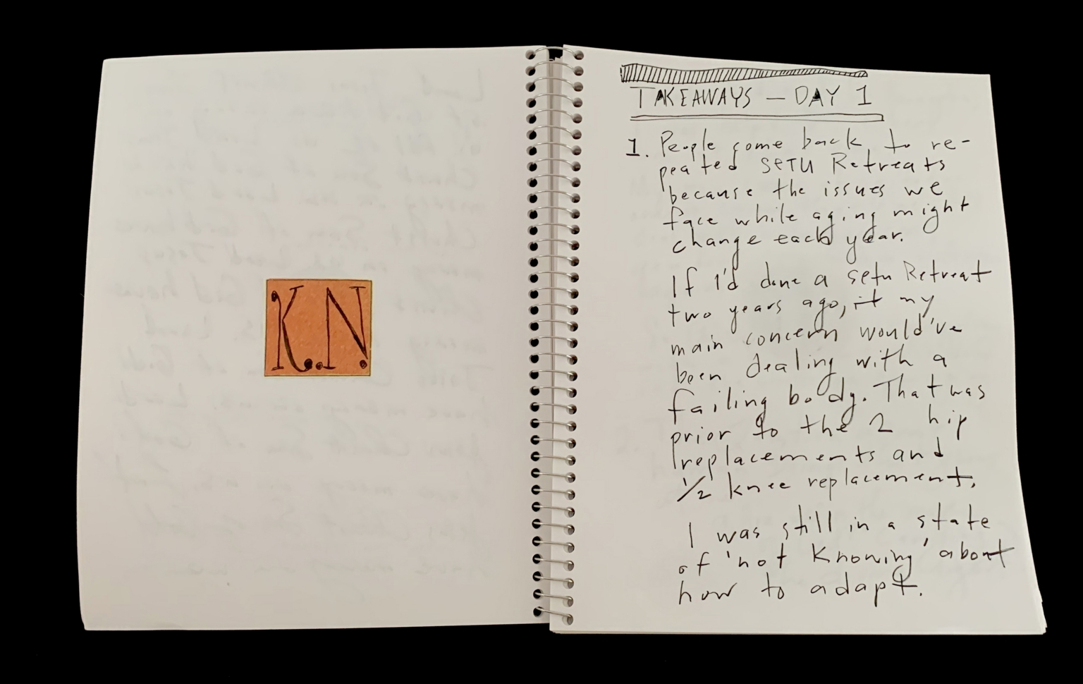 - The page is from a spiral-bound notebook. The left page features a decorative initial "K.N." in an orange square with a stylized design. The right page contains handwritten text discussing reflections on repeated SEIU Retreats and personal health challenges. The handwriting is neat and legible, with a consistent font style. There are no other images or photos, but there is a simple line drawing at the top of the right page.