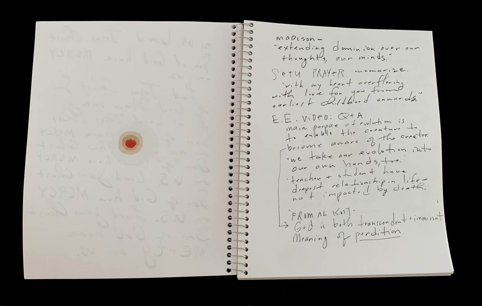 - Beginning of the pandemic; Kelly; Online retreat; Zoom retreat; Meditation center; Blue Mountain Center of Meditation; Tomales, California; Setu; Bridge; Post-65 chapter of life; Finite bodies; Eight Point program; Mantram; Jesus Prayer; “Lord Jesus Christ Son of God Have Mercy on Us”; Passage Meditation; 2005; Holy name; Immanuel Lutheran Church; Columbus, Nebraska; Church doctrine; Christ’s teachings; Hurricane Katrina; Suffering; Displacement; Dallas; Texas; Mercy; Ancient mantrams; Divine spirit; Covid-19; Lockdown; Stillness; Reflection; Mantram prayer; All living beings; Initials on pages; Right hand page; Prayer practice; Spiritual connection; Repetition; Contemplation; Sacred words