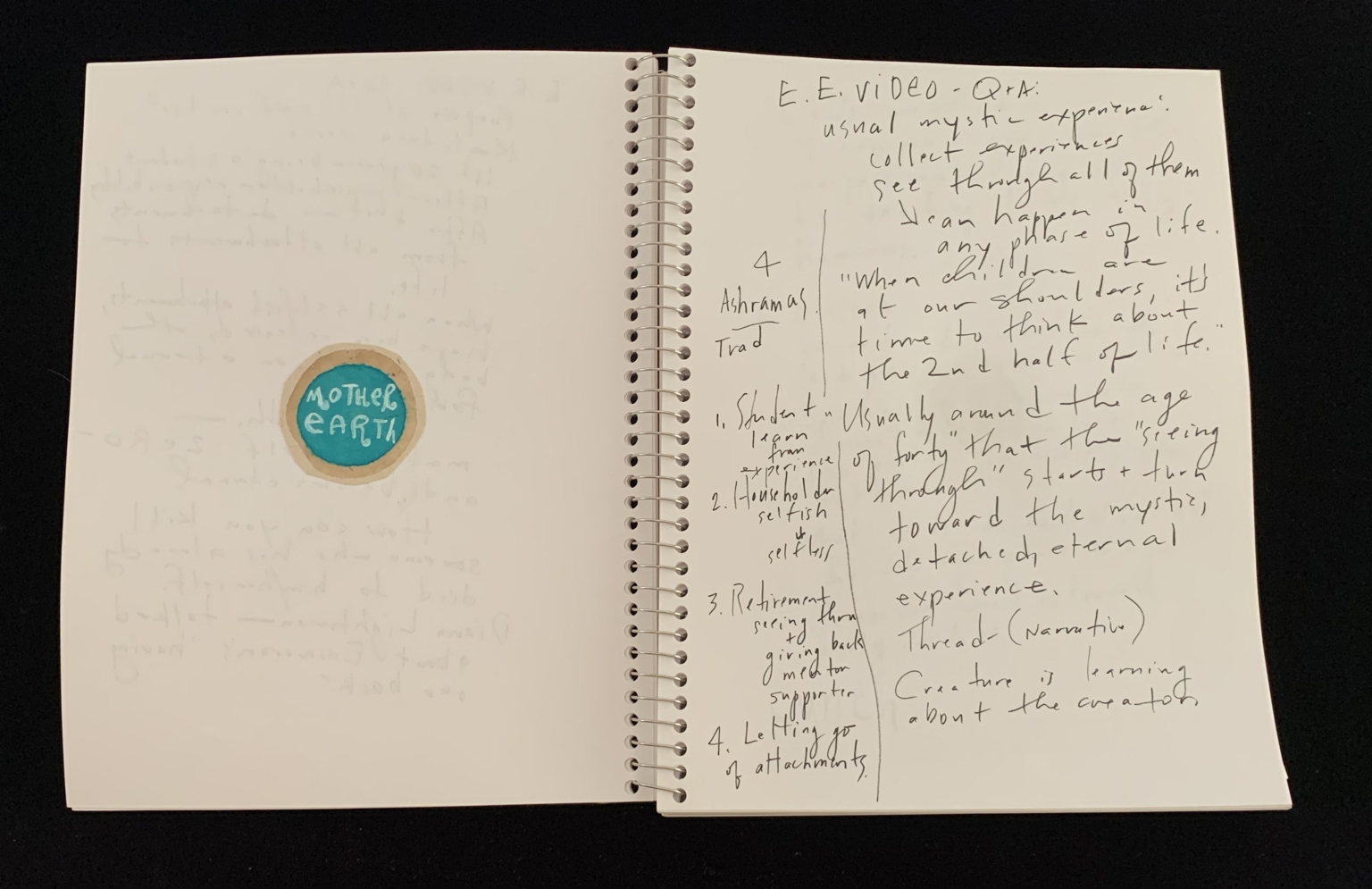 - The image shows an open spiral-bound notebook. On the left page, there is a circular sticker with the words "MOTHER EARTH" written in blue ink. The right page contains handwritten notes. The text is organized into numbered points and includes phrases such as "E.E. VIDEO Q&A," "usual mystic experience," and "4. Ashramatic Triad." The handwriting is neat and legible.