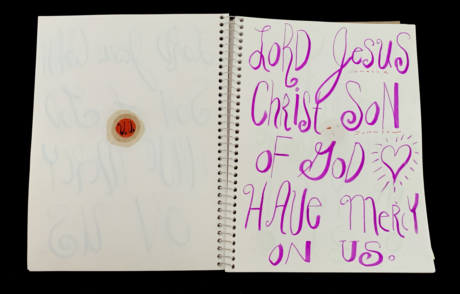 - The image shows an open spiral-bound notebook page. The left page is blank except for faint, repeated cursive writing of the phrase "Lord Jesus Christ Son of God." The right page contains a handwritten prayer in bold purple ink: "Lord Jesus Christ Son of God have mercy on us." A small, circular sticker with a red and orange design is affixed to the left page near the center. The page appears to be part of a religious or spiritual journal.