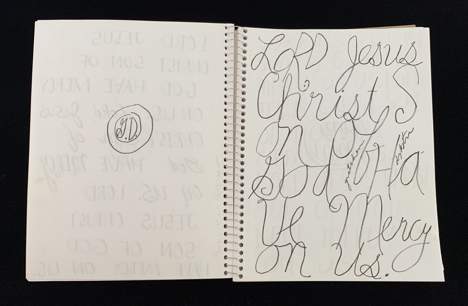 - The image shows an open spiral-bound notebook. The left page contains faint, repeated text in a cursive script, which appears to be a religious phrase. The right page displays a larger, more prominent calligraphic inscription in a flowing, cursive style. The inscription reads "Lord Jesus Christ have mercy on us." The handwriting is elegant and deliberate, with decorative flourishes. A small, circular doodle with the initials "J.D." is present on the left page near the center.