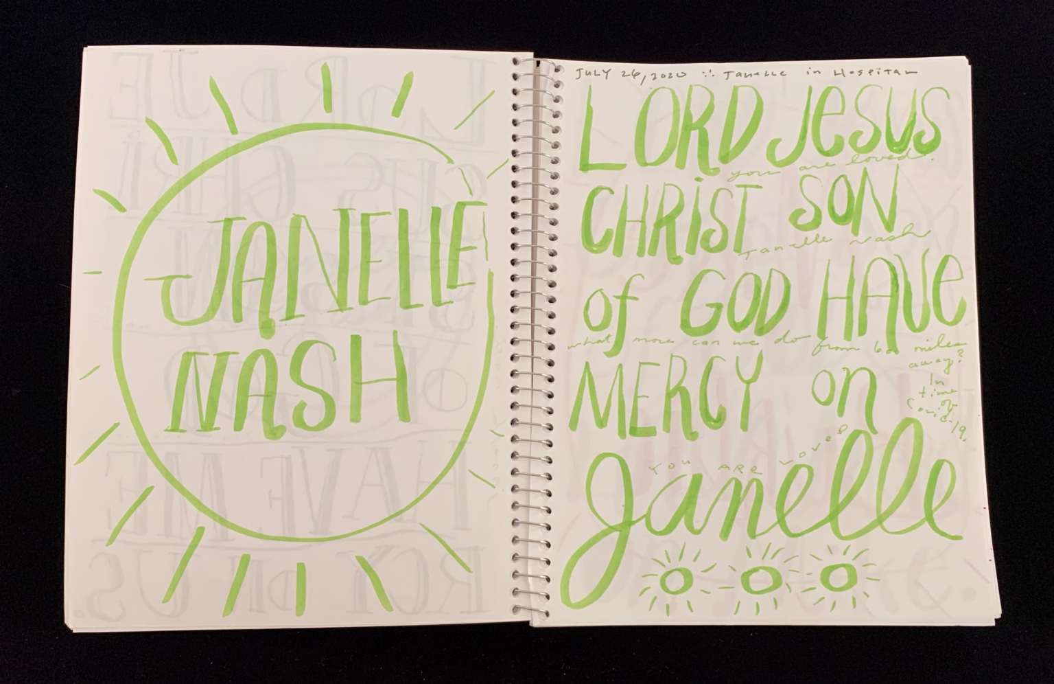 - The image shows an open spiral-bound notebook page. The left page contains a large, hand-drawn sun with the name "Janelle Nash" written inside it in a cursive, green font. The right page has handwritten text in the same green cursive font, reading: "JULY 16, 2020 Janelle in Hospital LORD JESUS CHRIST SON OF GOD HAVE MERCY ON JANELLE YOU ARE LOVED." The text is accompanied by small decorative elements, such as dots and lines, around the words "Janelle" and "Mercy."