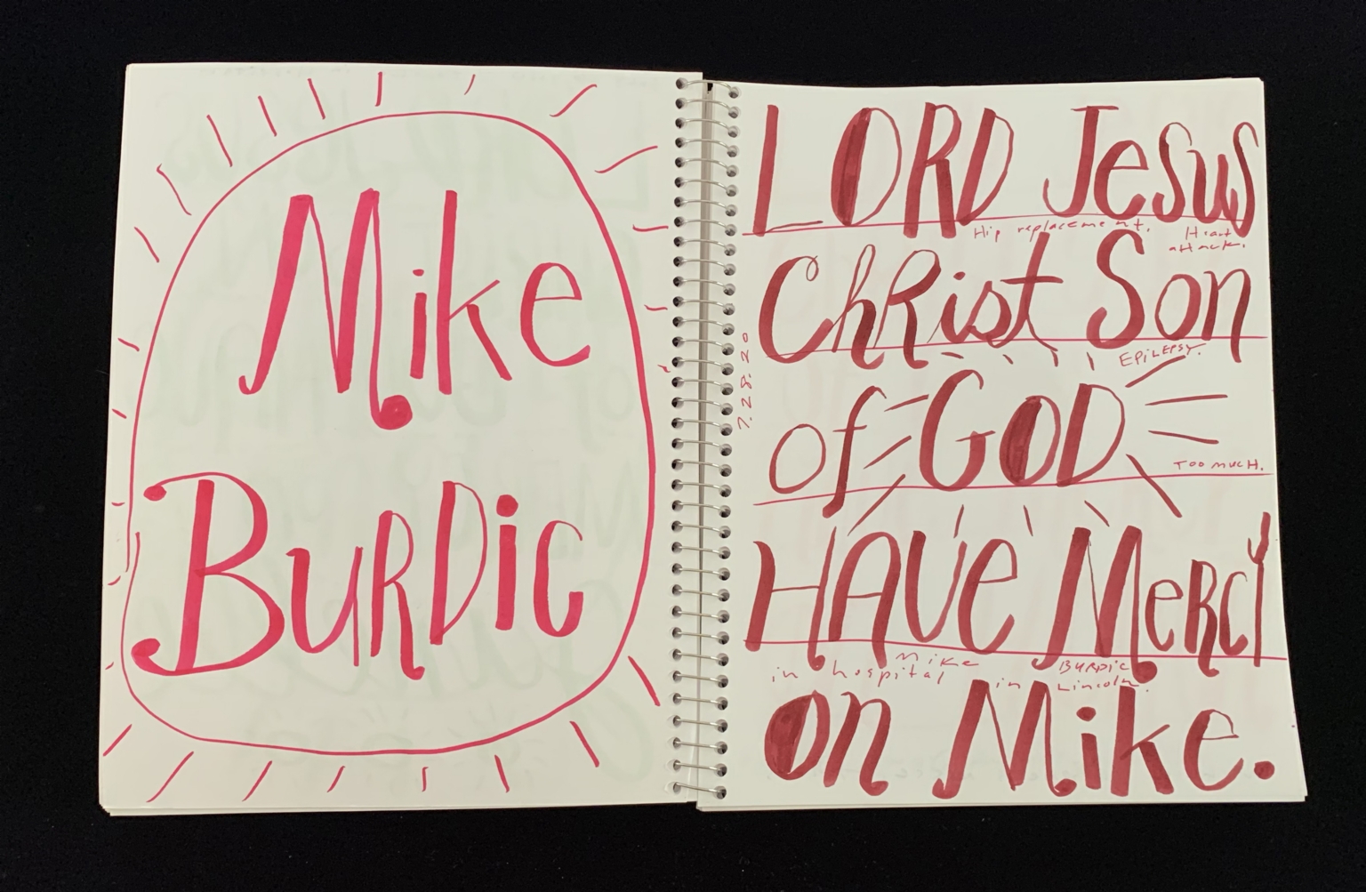 - The image shows a handwritten page from a spiral-bound notebook. The left page contains the name "Mike Burdic" in a large, cursive font, enclosed within a circular design with radiating lines. The right page contains a prayer written in a similar cursive style, with the text "LORD Jesus Christ Son of God HAVE MERCY on Mike." The handwriting is in red ink, and there are some annotations and underlines in the text. The page appears to be part of a personal or religious journal.
