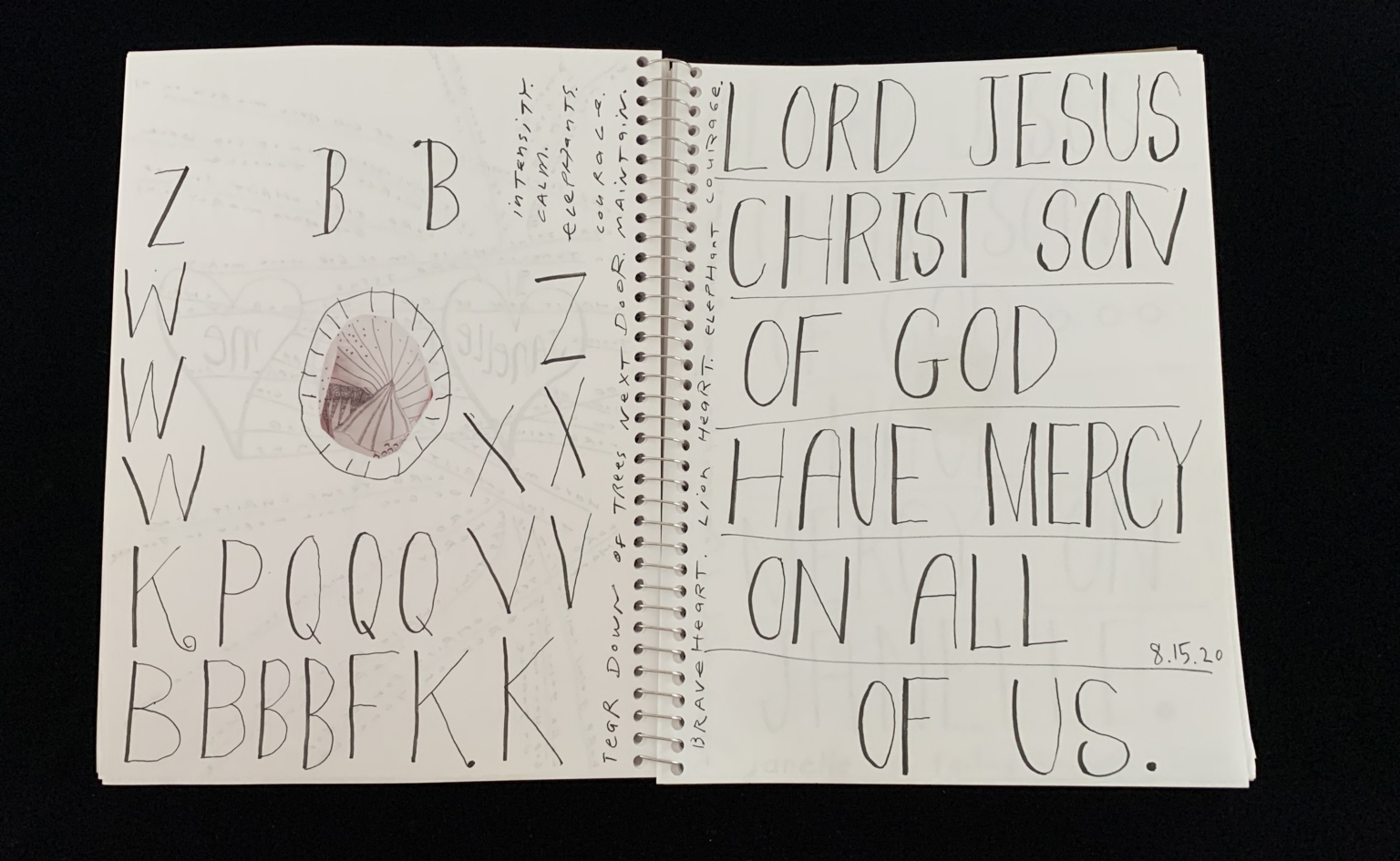 - Beginning of the pandemic; Kelly; Online retreat; Zoom retreat; Meditation center; Blue Mountain Center of Meditation; Tomales, California; Setu; Bridge; Post-65 chapter of life; Finite bodies; Eight Point program; Mantram; Jesus Prayer; “Lord Jesus Christ Son of God Have Mercy on Us”; Passage Meditation; 2005; Holy name; Immanuel Lutheran Church; Columbus, Nebraska; Church doctrine; Christ’s teachings; Hurricane Katrina; Suffering; Displacement; Dallas; Texas; Mercy; Ancient mantrams; Divine spirit; Covid-19; Lockdown; Stillness; Reflection; Mantram prayer; All living beings; Initials on pages; Right hand page; Prayer practice; Spiritual connection; Repetition; Contemplation; Sacred words