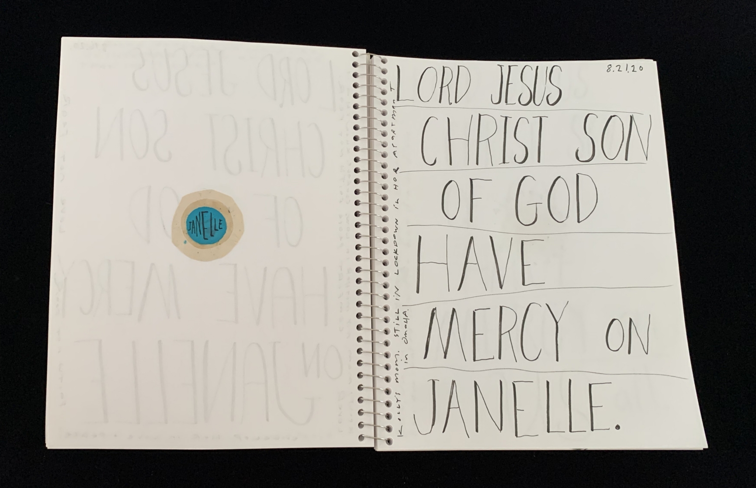 - The image shows an open spiral-bound notebook. The left page has faint, repeated text in a light gray, which appears to be a watermark or a design element. The right page contains a handwritten prayer. At the top, the text reads "LORD JESUS CHRIST SON OF GOD HAVE MERCY ON JANELLE." Below this, there is a small, circular sticker with the name "JANELLE" in a blue circle. The notebook appears to be on a black background.