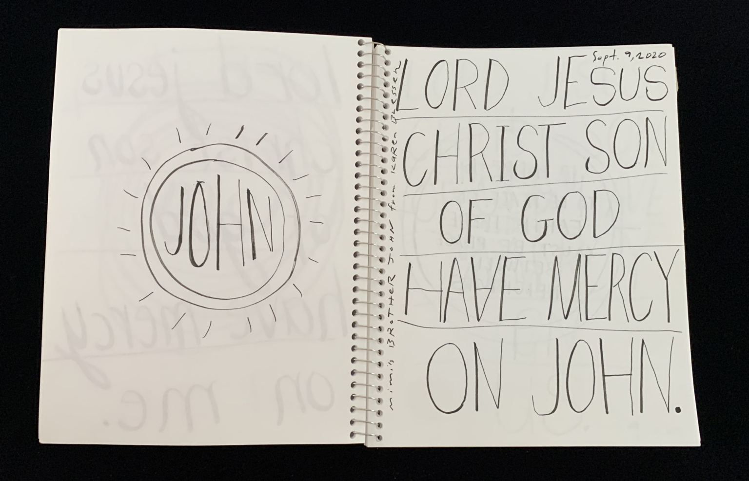 - The image shows an open notebook with handwritten text on the right page. The left page contains a circular doodle with the word "JOHN" inside it, surrounded by radiating lines. The right page has a prayer written in large, bold letters: "LORD JESUS CHRIST SON OF GOD HAVE MERCY ON JOHN." The date "Sept. 9, 2020" is written in the top right corner. The notebook appears to be spiral-bound, and the pages are white.