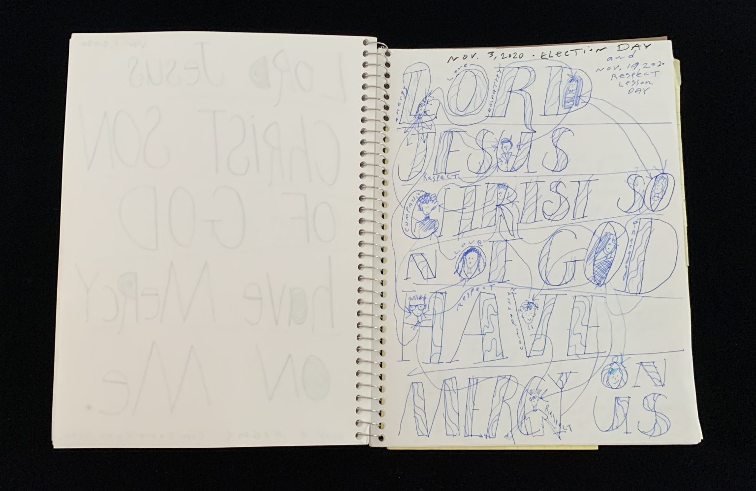 - The image shows an open spiral-bound notebook. The left page is blank, with faint, erased text visible beneath the surface. The right page contains handwritten text in blue ink, featuring religious phrases such as "Lord Jesus Christ Son of God" and "Have Mercy on Us." There are also small, abstract doodles scattered throughout the text. The top right corner of the page is dated "Nov 3, 2020 - Election Day."