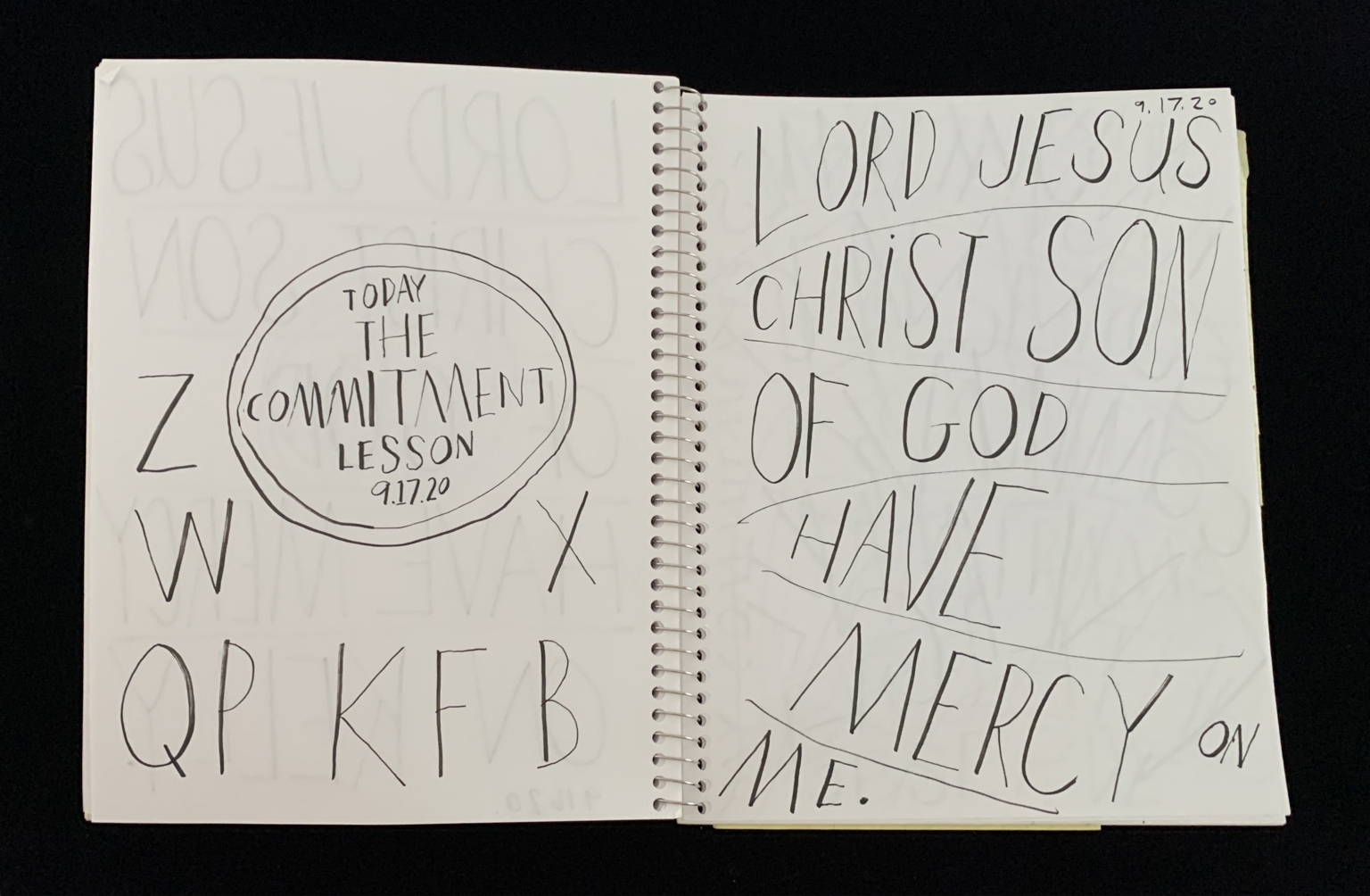 - Beginning of the pandemic; Kelly; Online retreat; Zoom retreat; Meditation center; Blue Mountain Center of Meditation; Tomales, California; Setu; Bridge; Post-65 chapter of life; Finite bodies; Eight Point program; Mantram; Jesus Prayer; “Lord Jesus Christ Son of God Have Mercy on Us”; Passage Meditation; 2005; Holy name; Immanuel Lutheran Church; Columbus, Nebraska; Church doctrine; Christ’s teachings; Hurricane Katrina; Suffering; Displacement; Dallas; Texas; Mercy; Ancient mantrams; Divine spirit; Covid-19; Lockdown; Stillness; Reflection; Mantram prayer; All living beings; Initials on pages; Right hand page; Prayer practice; Spiritual connection; Repetition; Contemplation; Sacred words