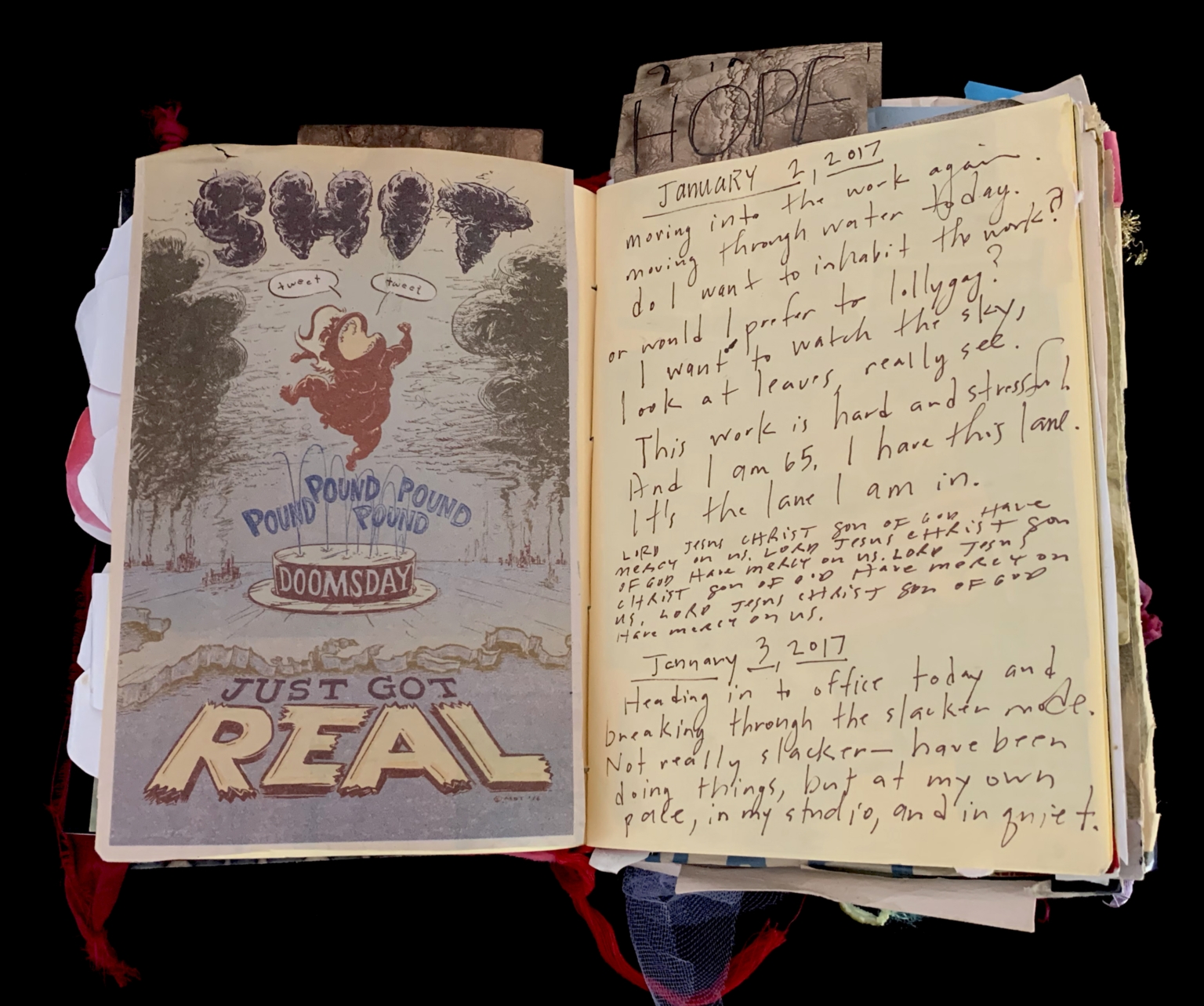 - The left page contains a hand-drawn illustration of a figure in distress, labeled "Just Got Real," with the phrase "Pound Pound Round Doomsday" around a circular object. The right page is filled with handwritten text, including a date, reflections on personal challenges, and spiritual musings. The page is adorned with various ribbons and small pieces of paper, adding a personal and eclectic touch.