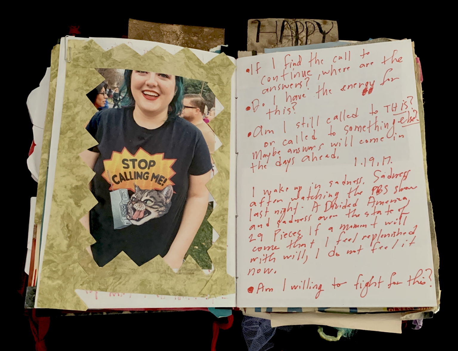 - The page is a collage with a photograph of a person with blue hair, wearing a black t-shirt with a graphic of a cat and the text "STOP CALLING ME!" The background of the photo appears to be a crowd or a public setting. The page is torn at the top, revealing a piece of paper with the word "HAPPY" written on it. Handwritten notes are scattered across the page, with red ink used for the text. The notes include questions and reflections, such as "Am I still called to THIS?" and "Am I willing to fight for this?" The overall aesthetic is informal and personal, with a mix of text and imagery.