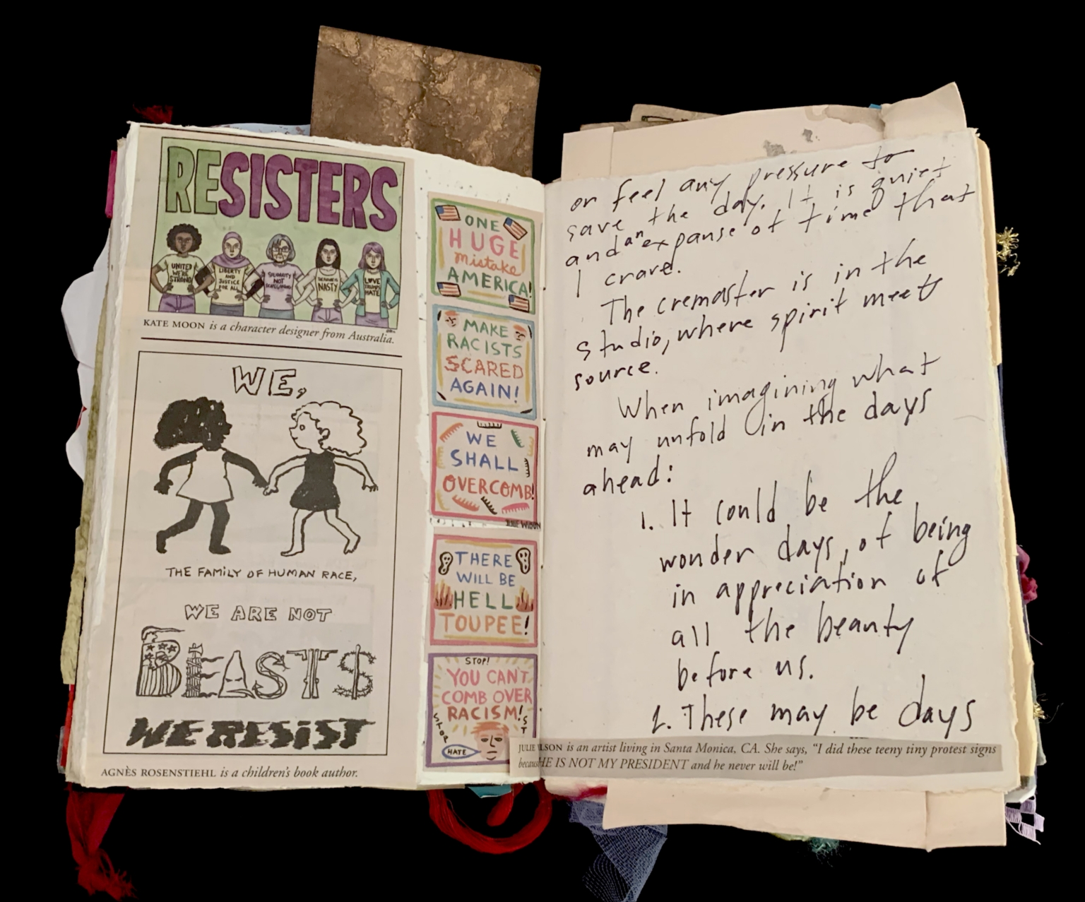 - The image features a collection of protest signs and handwritten notes. The signs include phrases like "We are not beasts," "We resist," and "We shall overcome." The handwritten notes discuss the future, mentioning "The wonder days of being in appreciation of all the beauty before us" and "These may be days." The signs are colorful and bold, while the handwritten notes are in a cursive script, adding a personal touch to the collage.