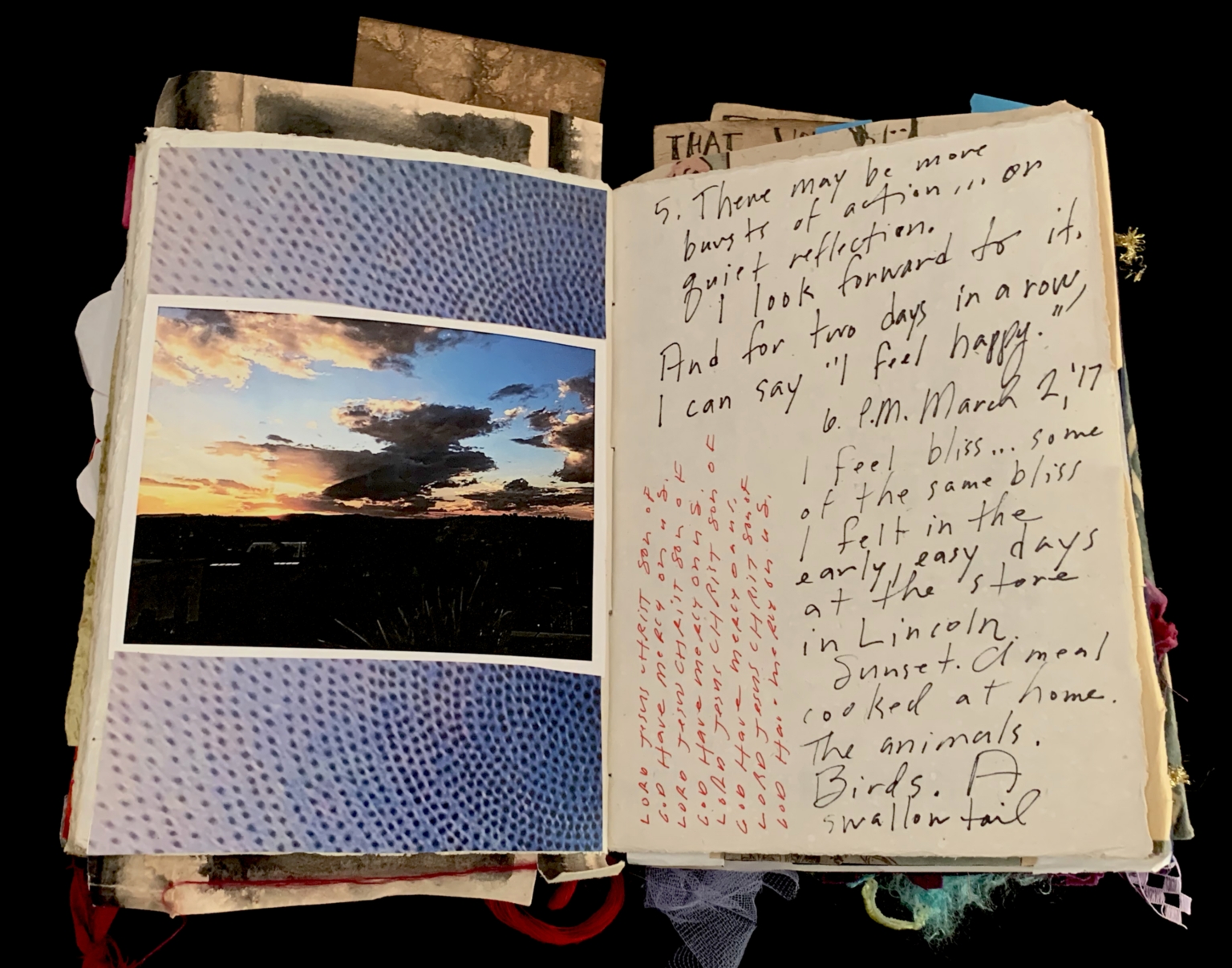 - The page is part of a scrapbook. It includes a photograph of a sunset with a gradient sky transitioning from orange to blue, and dark silhouettes of trees or landscape in the foreground. Below the photograph are two abstract, textured patterns in shades of blue and white. The right-hand page contains handwritten text in black and red ink, with various notes and reflections. The background of the page is decorated with small pieces of fabric and other ephemera, adding a collage-like quality.