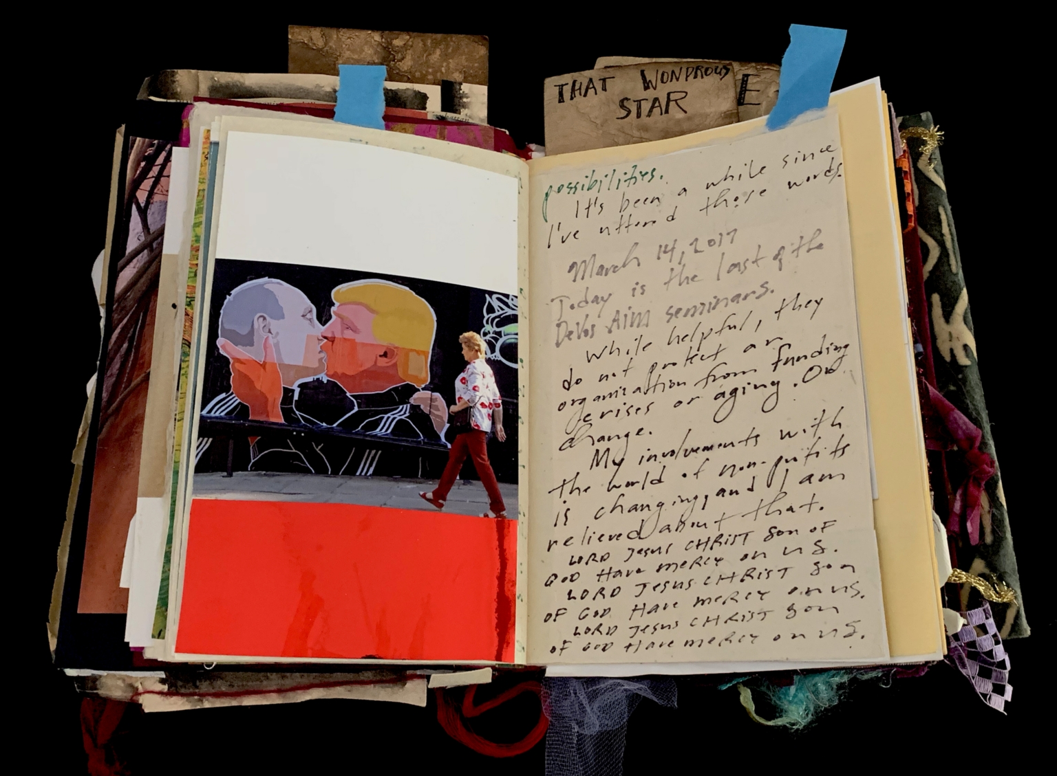 - The page is a collage with a photograph of a person walking past a mural depicting two figures in profile, one with a red background. The mural appears to be a political or satirical piece. The photograph is partially obscured by a piece of paper with handwritten notes. The notes are written in cursive and include phrases such as "possibilities," "March 14, 2017," and references to "Jesus Christ Son of God." The page is adorned with various pieces of paper, tape, and what appears to be a torn piece of fabric or ribbon.