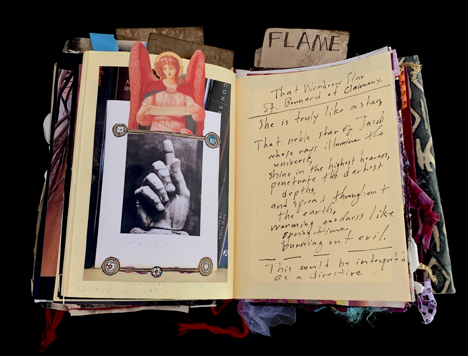- The page is part of a scrapbook or journal. It includes a photograph of a hand, a printed image of an angel with red wings, and a handwritten note. The angel image is framed with decorative elements, and the photograph of the hand is similarly adorned. The page is layered with various papers, ribbons, and other embellishments, giving it a textured and personal appearance. The handwritten note is in cursive and discusses a "Wonderful Star" and its qualities.