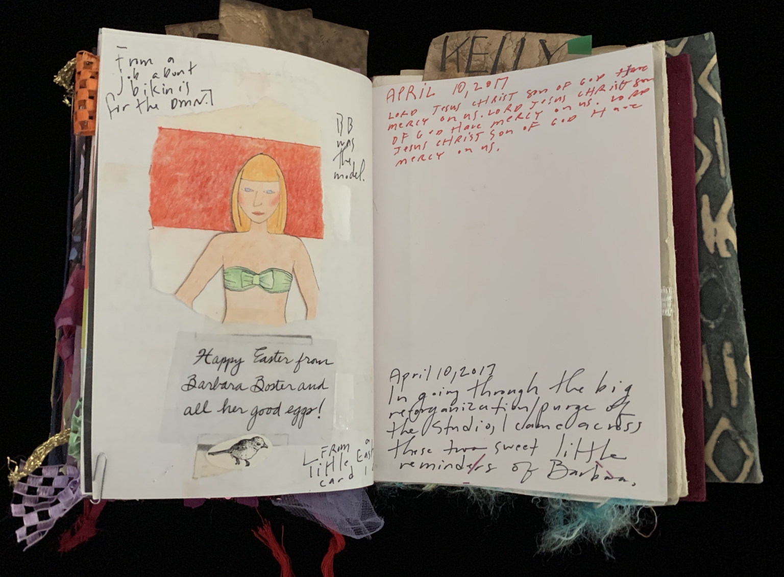 - The page is part of a scrapbook. On the left side, there is a drawing of a woman with blonde hair, wearing a green bikini top. Below the drawing, there is a handwritten note that reads, "Happy Easter from Barbara Docter and all her good eggs!" On the right side, there is a date entry in red ink that reads, "April 10, 2017," followed by a handwritten note that says, "April 10, 2017, In going through the big reorganization/purge of the Studio I came across these two sweet little reminders of Barbara." The page is decorated with various materials, including fabric and tassels, giving it a handmade, personal appearance.