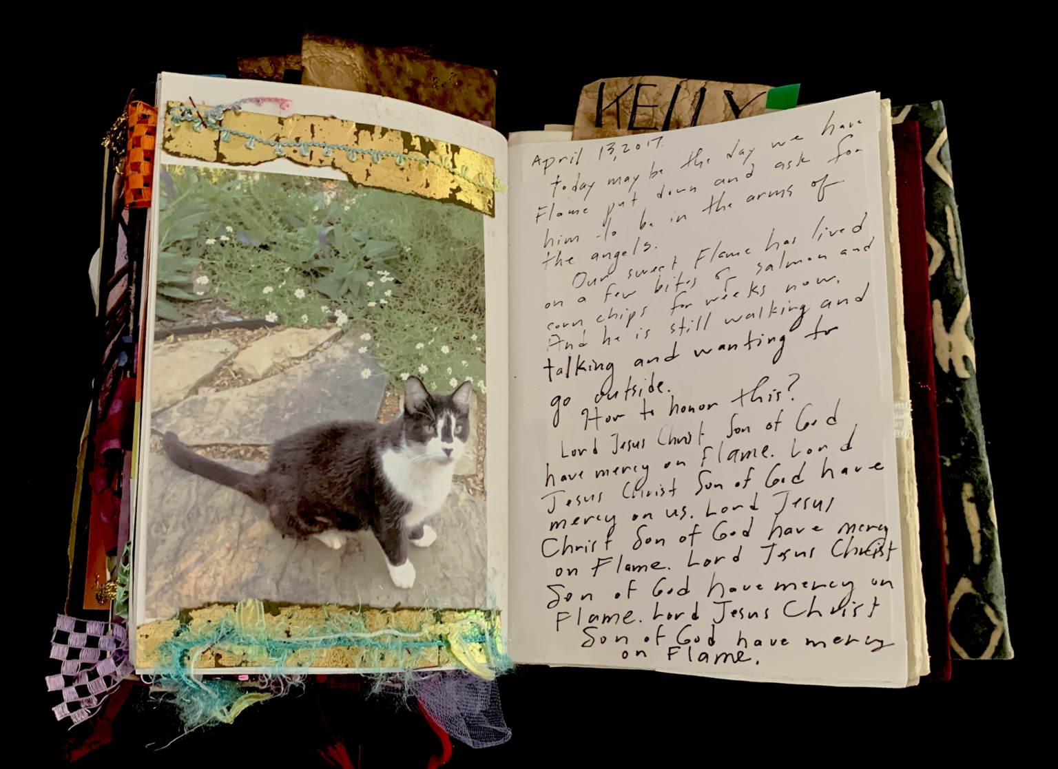 - The page is part of a scrapbook with a photograph of a black and white cat sitting on a stone path. The photo is bordered with decorative elements such as torn paper, fabric scraps, and string. The right-hand page contains handwritten text, with the top of the page labeled "KELLY." The text is written in cursive and includes a date, April 13, 2017, and expresses sentiments of loss and remembrance for a pet named Flame.