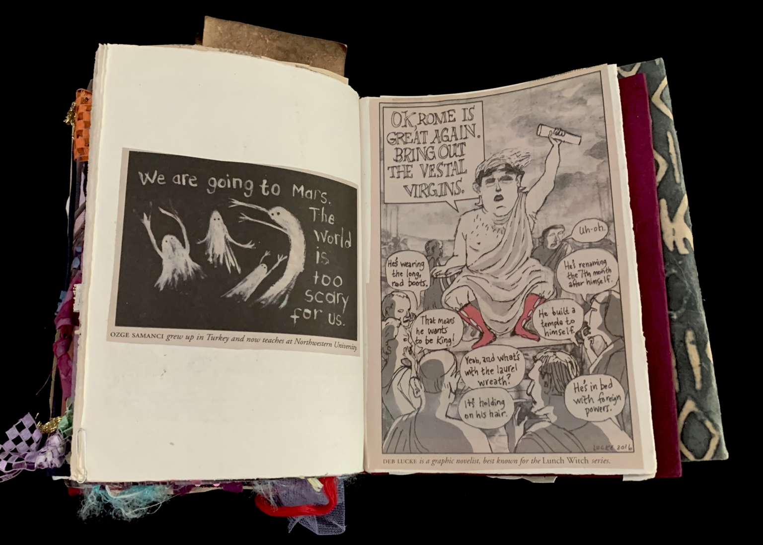 - The left page contains a black-and-white illustration of three ghostly figures with a bird-like creature, accompanied by the text: "We are going to Mars. The world is too scary for us." The right page is a detailed black-and-white illustration of a historical figure, possibly a Roman emperor, with various speech bubbles containing satirical commentary. The background includes other historical figures and elements, adding to the complexity of the scene. The art is layered with various textures and colors, including fabric and thread, giving it a collage-like appearance.