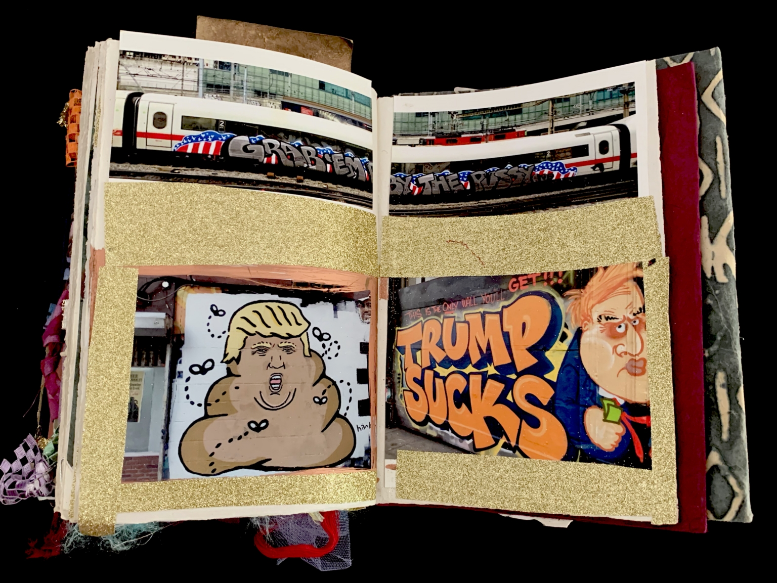 - The page is a collage of various images. At the top, there is a photograph of a train with American flags and graffiti that reads "GRAB 'EM BY THE RAZZLE DAZZLE." Below this, there are two Polaroid-style images. The left image depicts a cartoonish depiction of Donald Trump as a pile of feces with speech bubbles. The right image shows a caricature of Donald Trump with the text "TRUMP SUCKS" in bold, stylized letters. The background of this image is dark, and the text is outlined in orange.