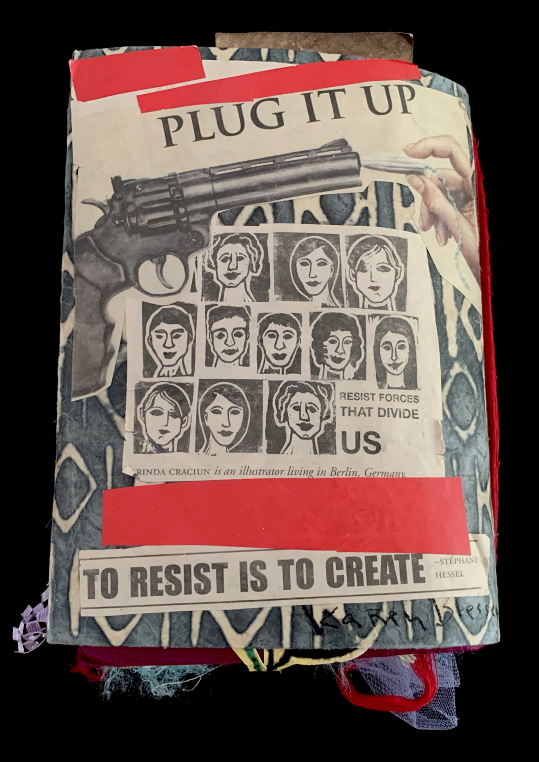- The image is a collage with a central focus on a hand holding a revolver. Below the revolver, there is a series of black-and-white portraits of faces. The background includes a patterned fabric with geometric designs. Overlaid text includes phrases such as "PLUG IT UP," "TO RESIST IS TO CREATE," and "RESIST FORCES THAT DIVIDE US." The text is in various fonts and sizes, with some parts highlighted in red. The overall aesthetic suggests a protest or activist theme.